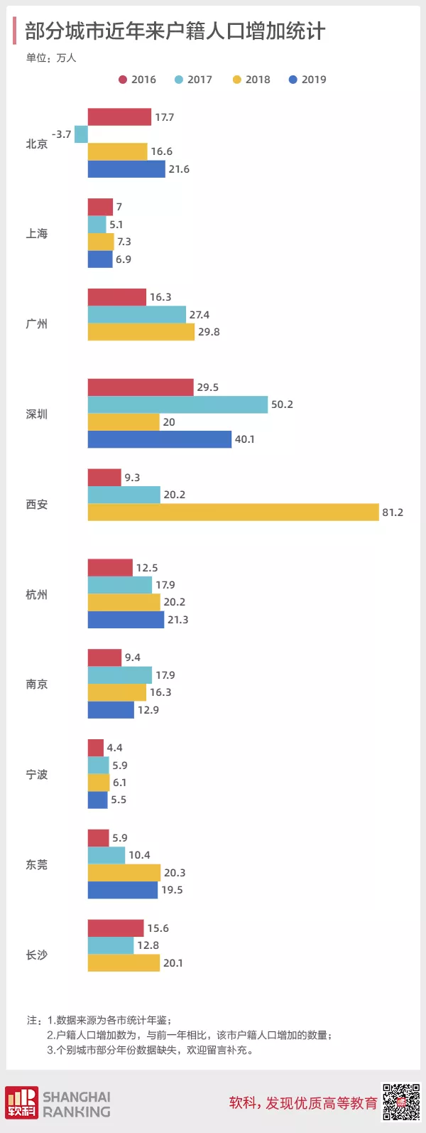 从17年开始,西安市就放宽了高校毕业生落户政策,年底新增了户籍人口20万人。18年时再度放宽落户要求,允许直系亲属举家随迁,直接导致到2018年底户籍人口增加了80万人。