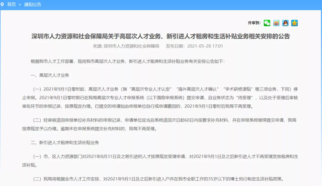深圳市人社局发布公告称,对现有的人才补贴政策作出调整:对2021年9月1日及之后新引进人才不再受理发放租房和生活补贴。此前,深圳市新引进人才租房和生活补贴的发放标准为:一次性发放,本科15000元/人,硕士25000元/人、博士30000元/人。