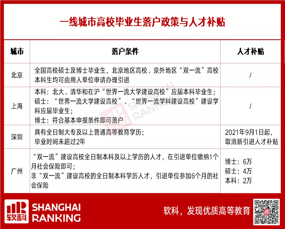 而同样是以一线城市的上海,在2020年9月发布落户新政,清北、复旦、上交大、同济、华东师大的应届本科生,以及重点大学和重点学科的应届硕士生可直接落户。