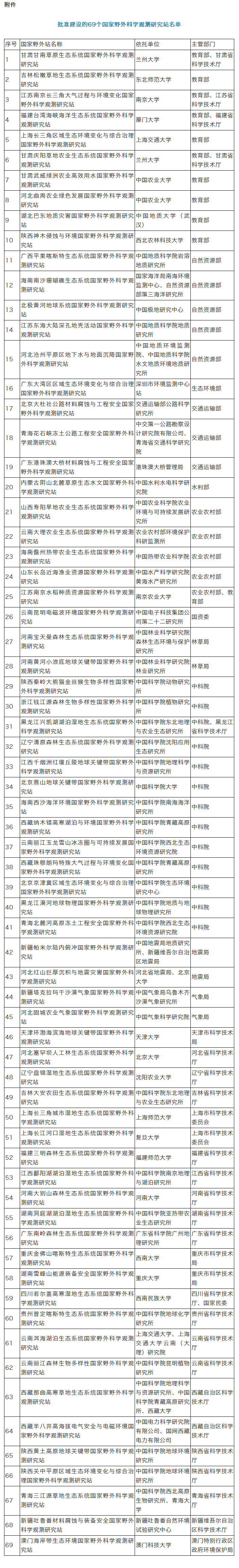 为更好地推进新时期国家野外站建设发展,优化完善国家野外站系统布局,根据《国家野外科学观测研究站管理办法》(国科发基〔2018〕71号)和《国家野外科学观测研究站建设发展方案(2019-2025)》(国科办基〔2019〕55号),经部门(地方)推荐和专家咨询,科技部决定批准“甘肃甘南草原生态系统”等69个野外站为国家野外站(具体名单见附件)。