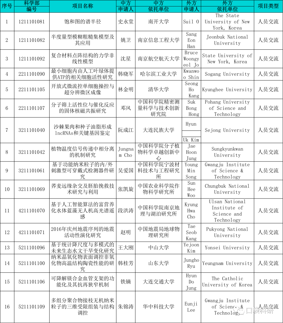 根据国家自然科学基金委员会(NSFC)与韩国国家研究基金会(NRF)的合作协议,双方每年共同征集和资助中韩研究人员之间的人员交流项目和双边学术研讨会项目。2021年度,经过公开征集,共受理人员交流项目申请127项,双边学术研讨会项目申请9项。根据专家评审结果并经双方机构协商,拟对以下29项人员交流项目和3项双边学术研讨会项目予以资助。人员交流项目的执行期为2022年1月1日至2023年12月31日,双边学术研讨会项目的执行期为2021年10与1日至2022年12月31日。