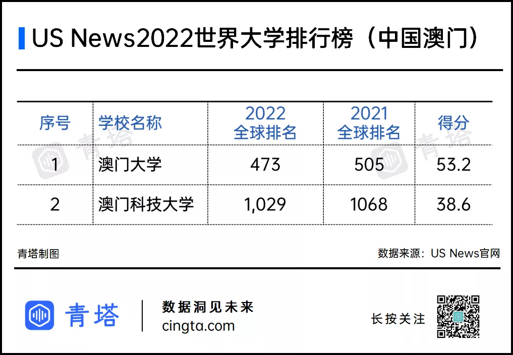中国澳门地区共有2所高校上榜,其中澳门大学位居全球473位,澳门科技大学居全球1029位。