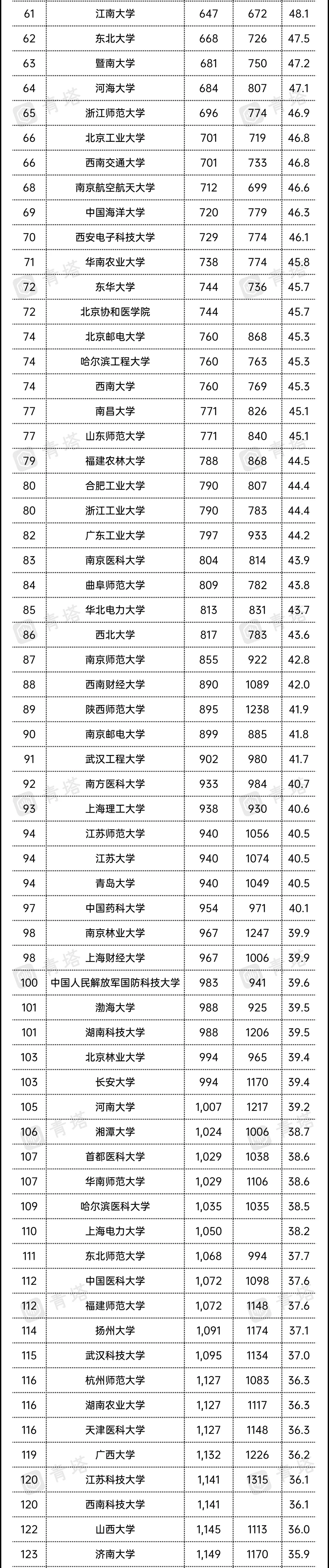 今年,中国内地共有11所大学进入全球200强,比去年增加3所。除了清华和北大,另外九所高校分别是上海交通大学(105名)、中国科学技术大学(110名)、浙江大学(115名)、南京大学(135名)、复旦大学(141名)、中山大学(159名)和中国科学院大学(159名)、华中科技大学(176名)、湖南大学(195名)。此外,排名靠前的高校还包括哈尔滨工业大学、武汉大学、同济大学、中南大学、华南理工大学、东南大学、西安交通大学等。