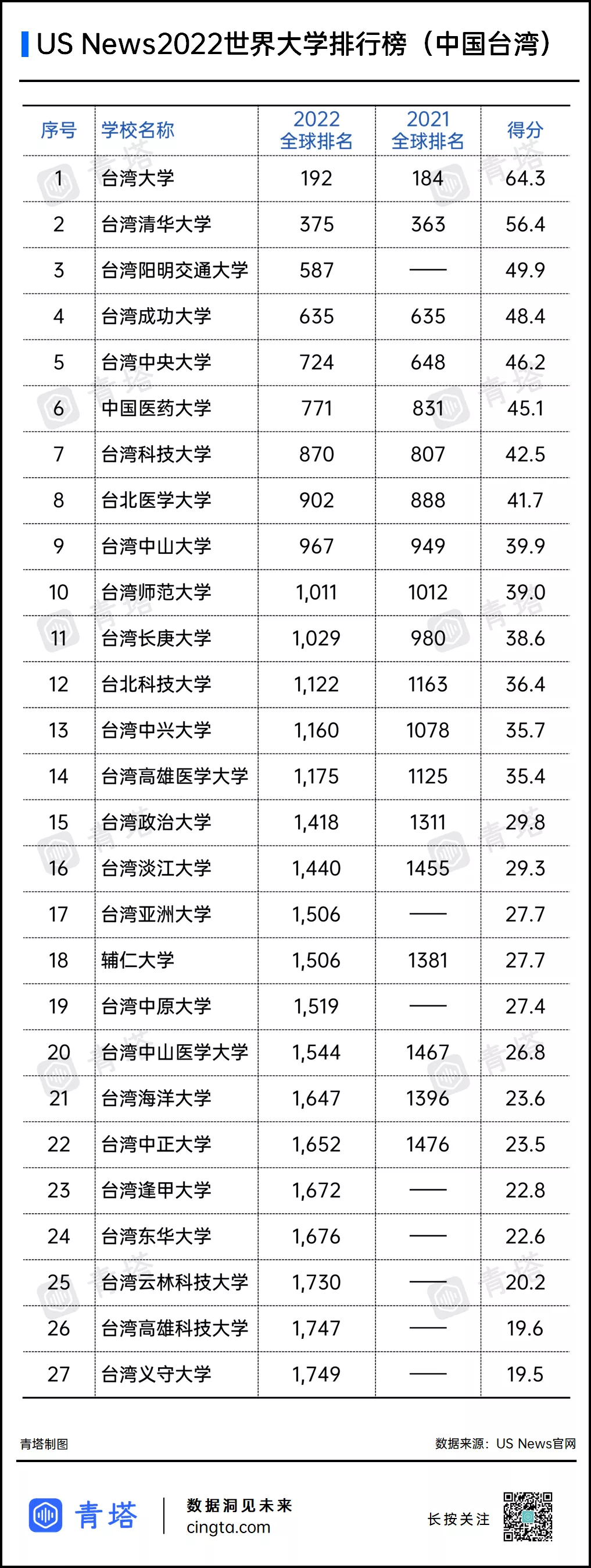 中国台湾地区共有27所高校上榜,其中排名最高的是台湾大学,排名全球192位。