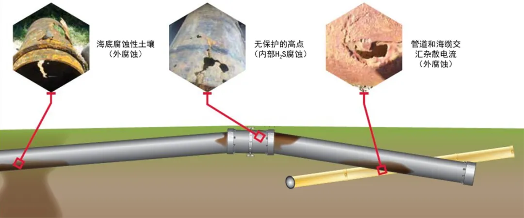 外腐蚀风险主要有保温层破损后的海水腐蚀、悬跨后管道力学与腐蚀交互、管道和海缆的杂散电流等。