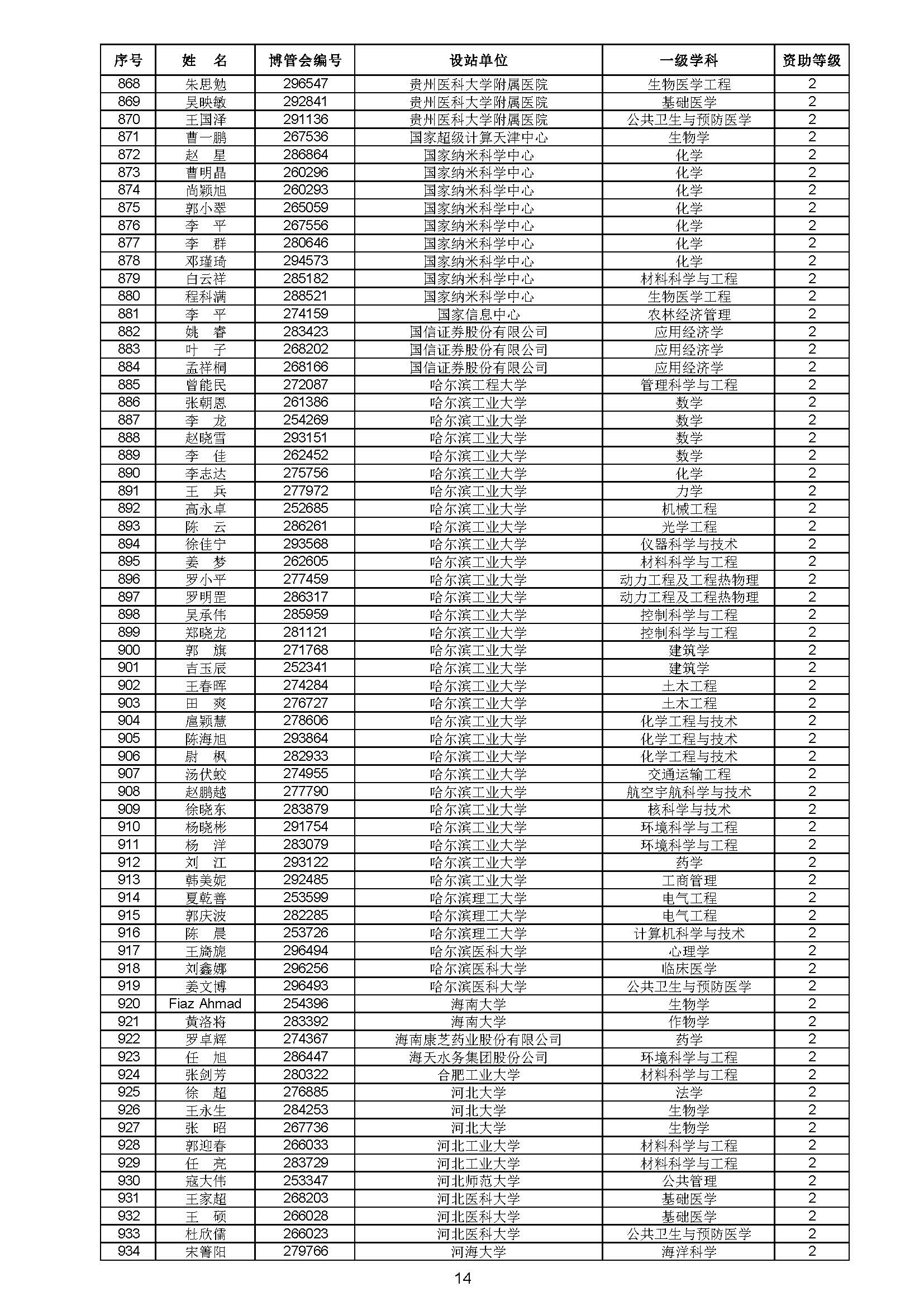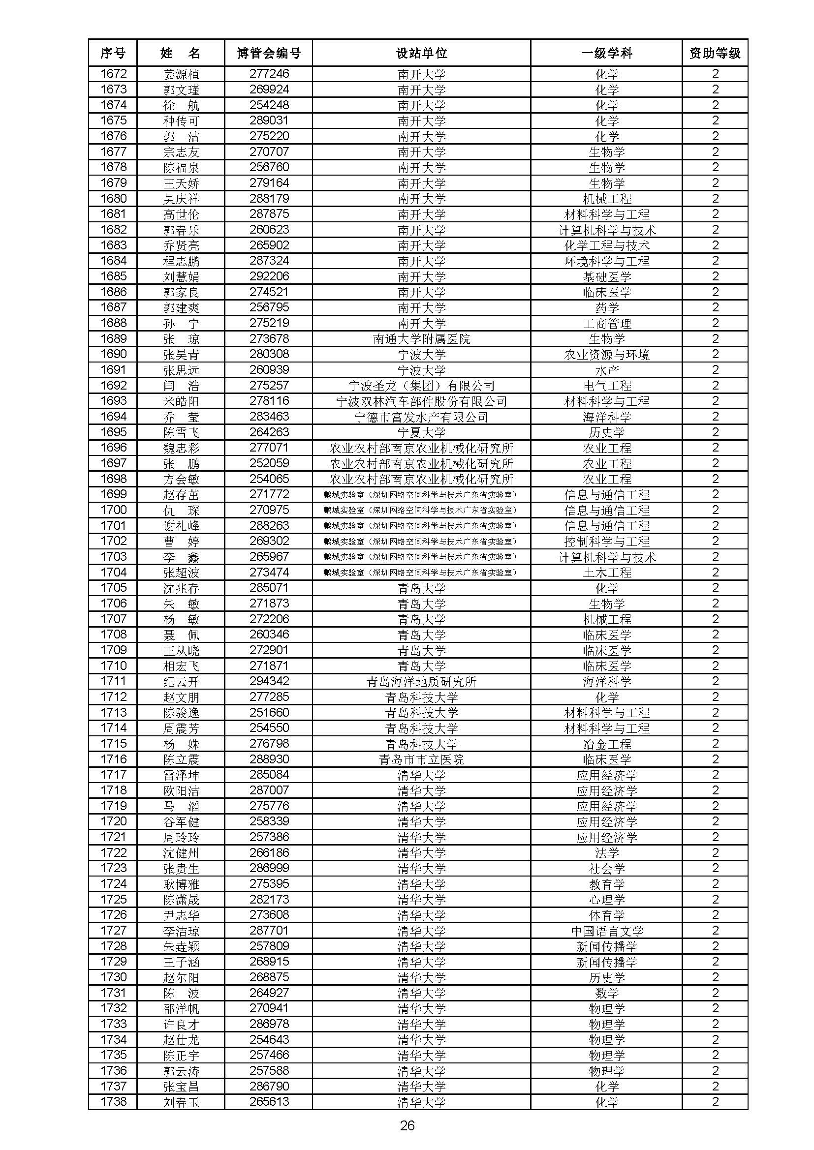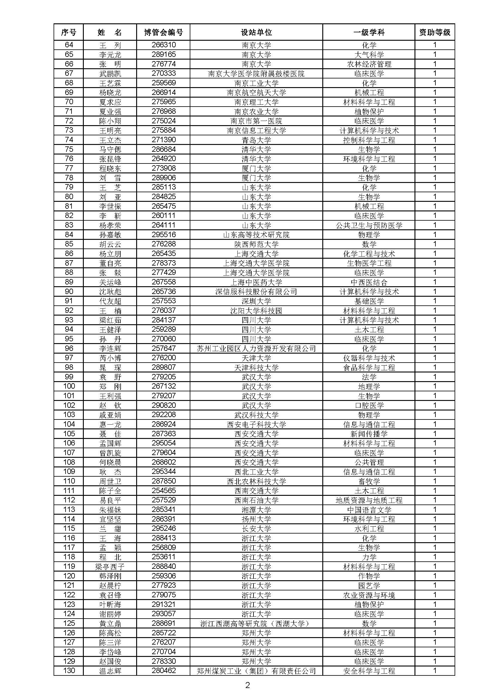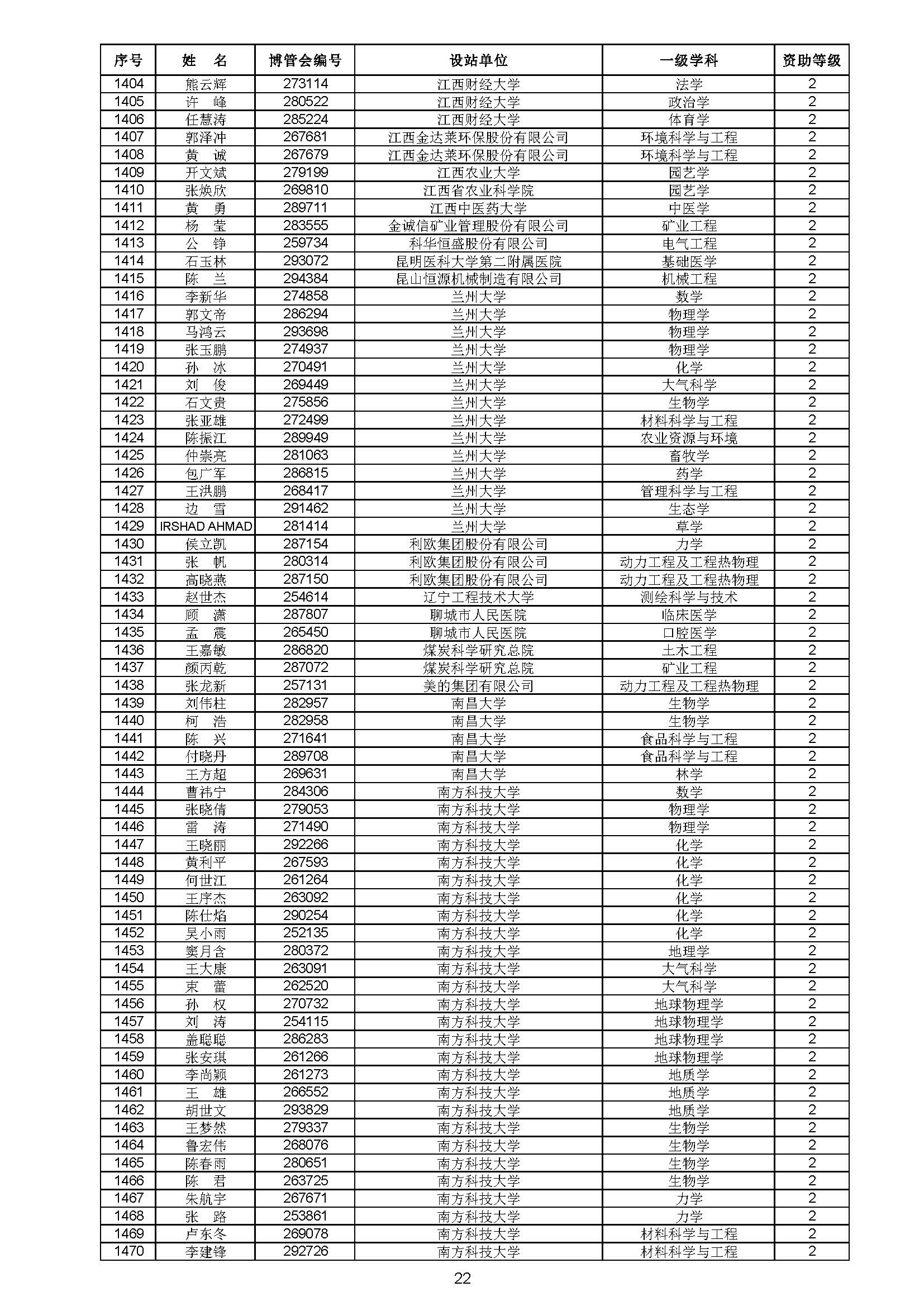 关于对中国博士后科学基金第70批面上资助拟资助人员名单进行公示的通知 中博基字〔2021〕10号 各博士后设站单位: 根据《中国博士后科学基金资助规定》,现对中国博士后科学基金第70批面上资助拟资助人员名单予以公示,军队系统拟资助人员名单由军队系统另行公示。公示期为11月8日至11月14日。 对公示内容有异议者,请于公示期内,以传真、信函或电子邮件方式向中国博士后科学基金会提交书面材料。个人提交的材料请署明真实姓名和联系方式,单位提交的材料请加盖所在单位博士后管理部门公章。期间,未获得资助的博士后研究人员可登录中国博士后科学基金管理信息系统查看专家评审结果。 通信地址:北京市海淀区学院路30号中国博士后科学基金会博士后基金管理处(100083) 联系人:池老师 电话:010-82387704 传真:010-62335023 邮箱:jijinchu@126.com 附件: 中国博士后科学基金会 2021年11月8日 第70批面上资助拟资助人员名单 第70批面上资助地区专项资助计划拟资助人员名单