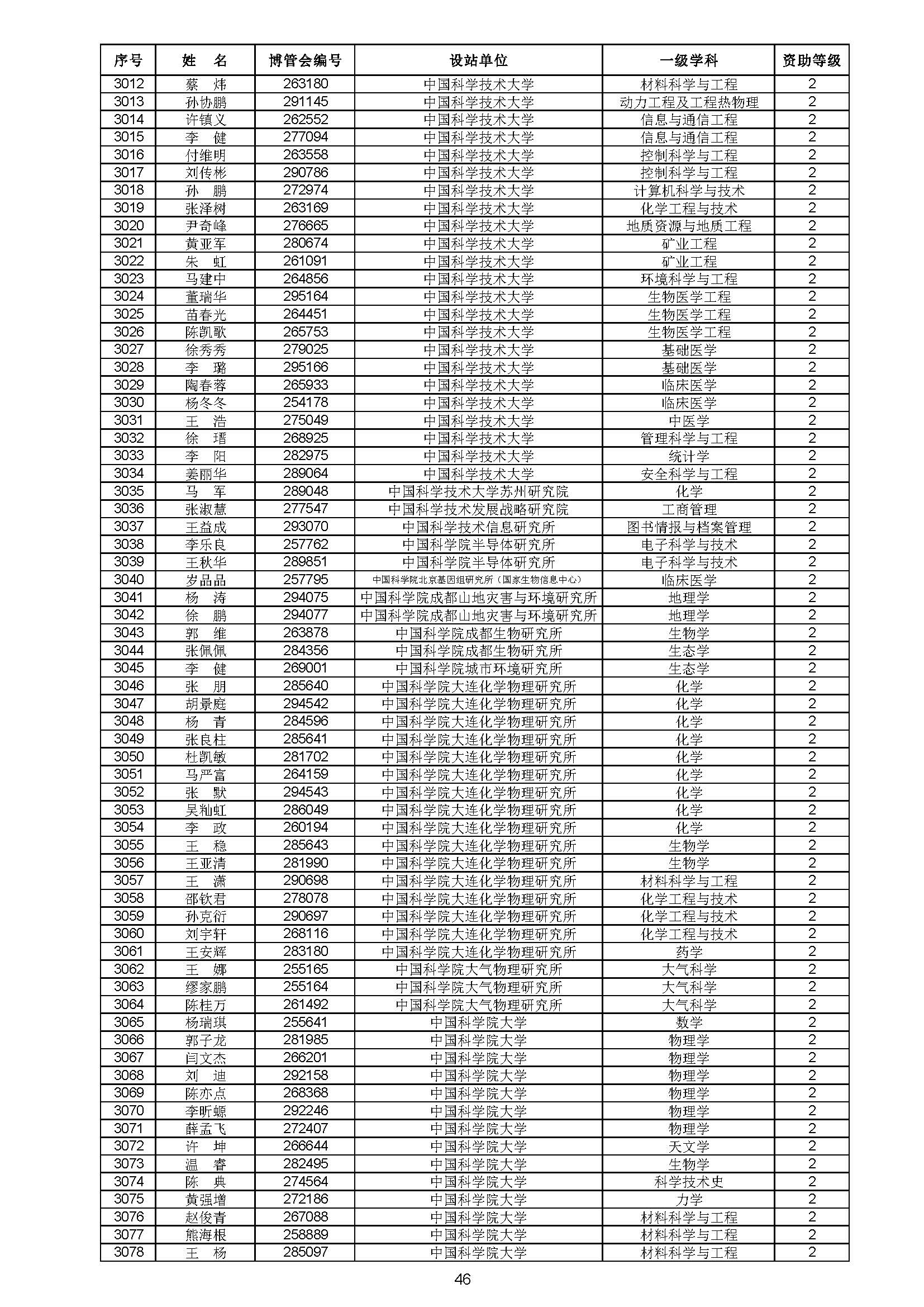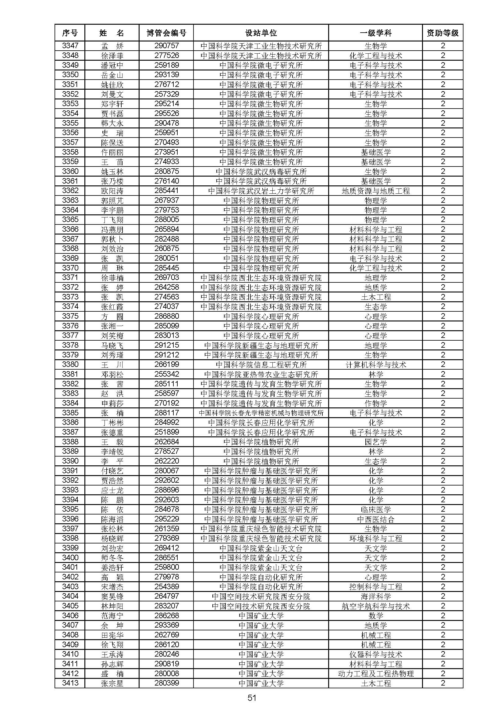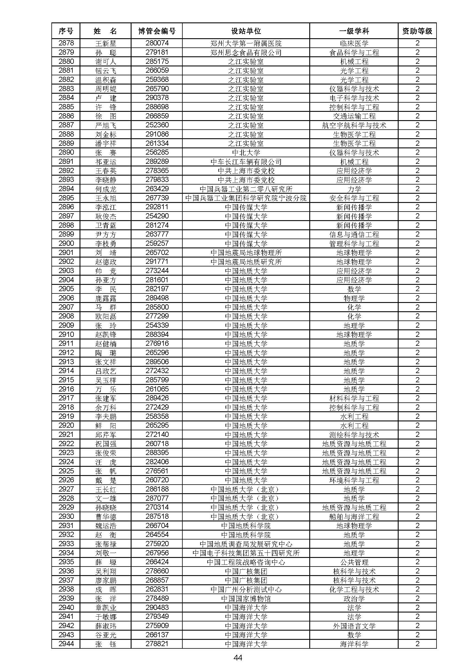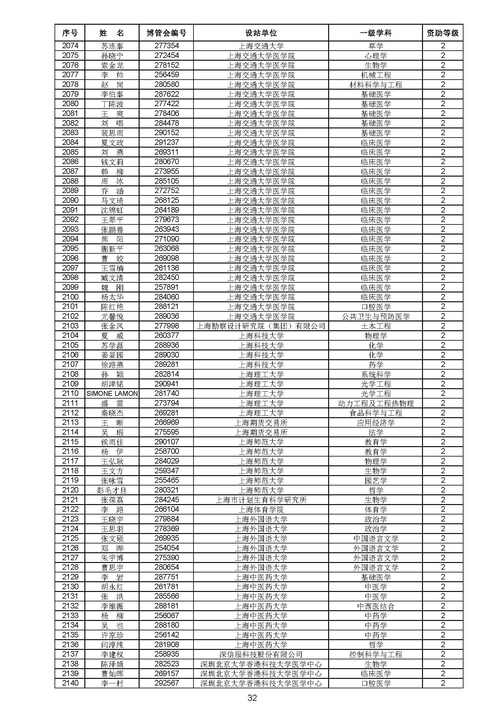 关于对中国博士后科学基金第70批面上资助拟资助人员名单进行公示的通知 中博基字〔2021〕10号 各博士后设站单位: 根据《中国博士后科学基金资助规定》,现对中国博士后科学基金第70批面上资助拟资助人员名单予以公示,军队系统拟资助人员名单由军队系统另行公示。公示期为11月8日至11月14日。 对公示内容有异议者,请于公示期内,以传真、信函或电子邮件方式向中国博士后科学基金会提交书面材料。个人提交的材料请署明真实姓名和联系方式,单位提交的材料请加盖所在单位博士后管理部门公章。期间,未获得资助的博士后研究人员可登录中国博士后科学基金管理信息系统查看专家评审结果。 通信地址:北京市海淀区学院路30号中国博士后科学基金会博士后基金管理处(100083) 联系人:池老师 电话:010-82387704 传真:010-62335023 邮箱:jijinchu@126.com 附件: 中国博士后科学基金会 2021年11月8日 第70批面上资助拟资助人员名单 第70批面上资助地区专项资助计划拟资助人员名单