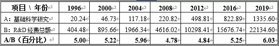 表2:中国基础科学研究费用在年度科技研发总经费中的占比(单位:亿元人民币)