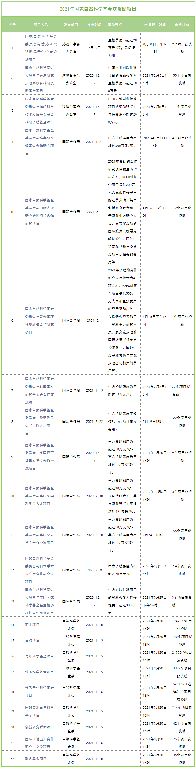为了方便大家充分了解各项目情况,动源君将已启动项目从资助强度、申报截止时间、发布部门、发布日期、申报状态五个方面将近期发布的基金指南情况做了汇总,数据均来源于国家自然科学基金委员会官网,供读者参考。