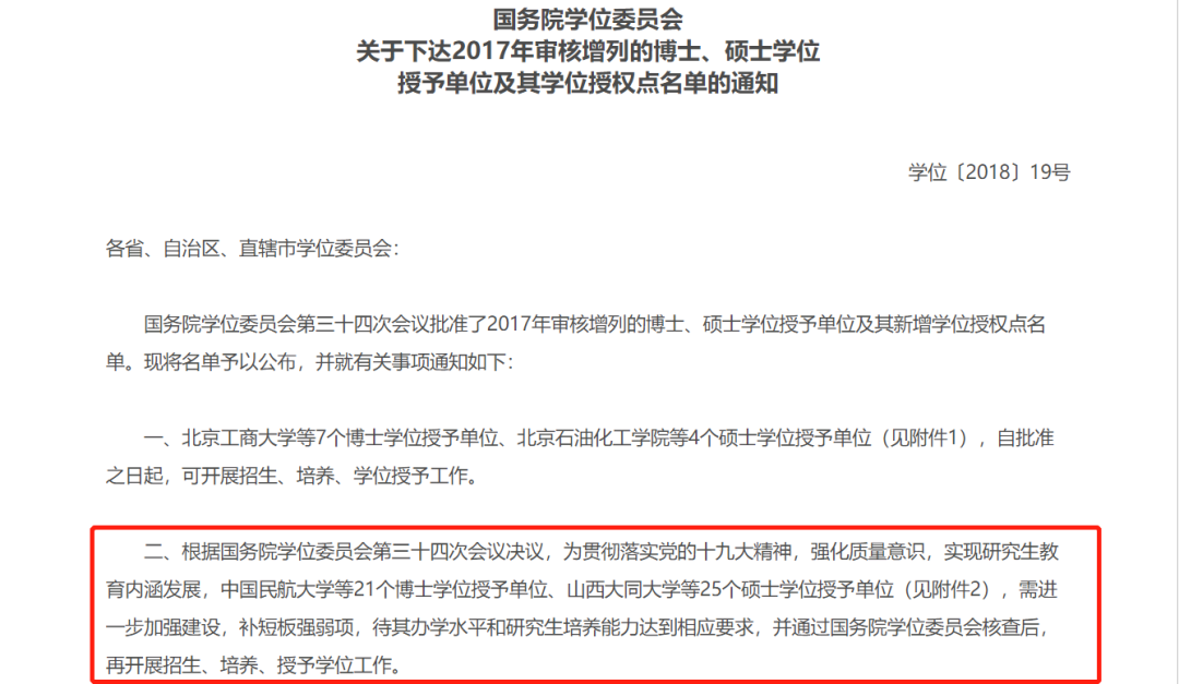 除此以外,截图显示,《通知》中还提到了北京电子科技学院等20个博士授予单位。根据《国务院学位委员会关于下达2017年审核增列的博士、硕士学位授予单位及其学位授权点名单的通知》的分类方式,这20所高校应为审核增列且需加强建设的博士学位授予单位。