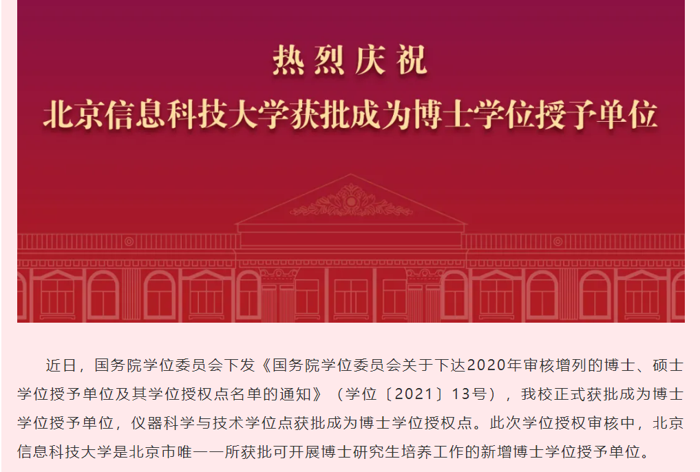 据北京信息科技大学消息,国务院学位委员会已于近日下发《国务院学位委员会关于下达2020年审核增列的博士、硕士学位授予单位及其学位授权点名单的通知》(学位〔2021〕13号)。