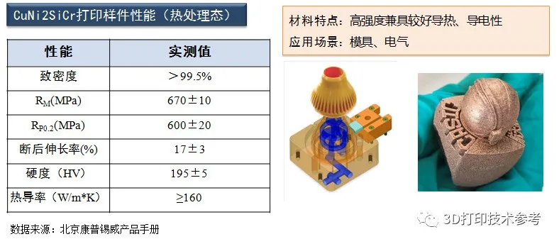 SLM Solutions公司于2019年推出CuNi2SiCr铜合金材料产品,该材料是一种可热处理硬化合金,具有高强度以及电导率和导热率的平衡组合,同时合金中包括镍和硅成分,具有很高的耐腐蚀性和耐磨性。CuNi2SiCr本身不是一个新成分,该材料对应美标C18000合金,SLM Solutions公司率先将该材料用于增材制造并开展了材料鉴定和参数验证工作,为增材制造铜合金家族增加了一项重要成员。CuNi2SiCr热处理后的强度明显高于CuCrZr等材料,同时还能保持一定的导热率和导电率,已经能够满足部分模具制造要求和导电件要求,因此在模具和电气领域将有重要应用。