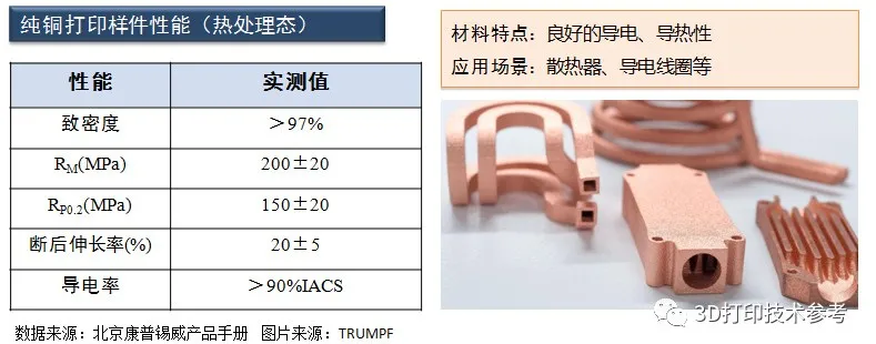 相对于如钛、铝、高温合金等产品,铜及铜合金的增材制造还不成熟。EOS自2019年为材料产品引入类似技术储备水平(TRL,Technology Readiness Level)的概念,目前两类铜材料标记为3级,属于验证通过水平,而IN718、AlSi10Mg等产品一般为7-9级。现阶段增材制造已经从模型验证逐渐转向产品制造,增材制造材料将进入根据应用选择或设计材料的阶段,铜及铜合金材料的更新迭代体现更为明显。可以预见随着工艺和材料的不断进步,铜材料的增材制造应用将会提升至一个新的水平。