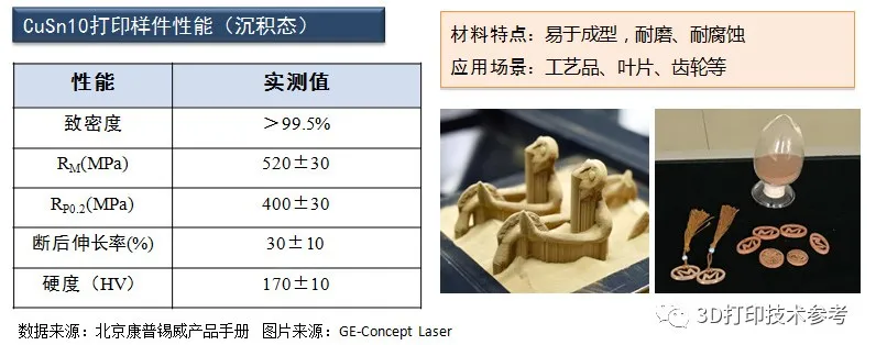 CuSn10作为一种铸造锡青铜易于成型,很多涉及铜材料的模型或工艺品打印选用CuSn10材料。CuSn10合金强度较高,耐磨和耐腐蚀性能优良,可以用于制造叶片、齿轮等耐磨零件,但其导电导热性能不高,因此对于有导电或导热要求一般不选用CuSn10。CuSn10属于目前增材制造铜合金材料中的常规产品。