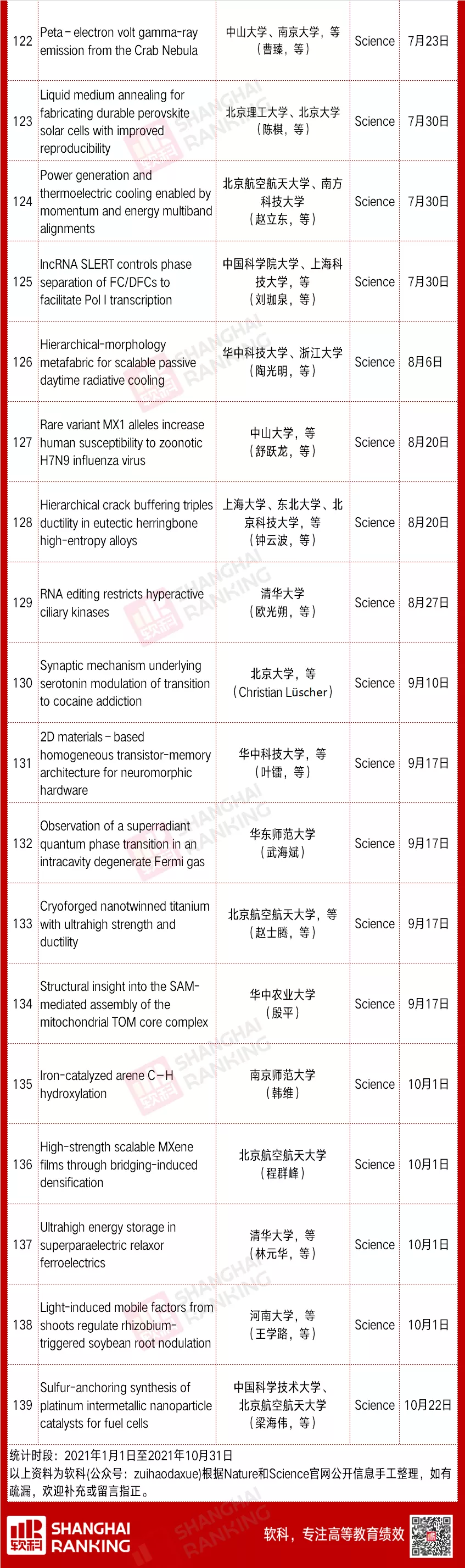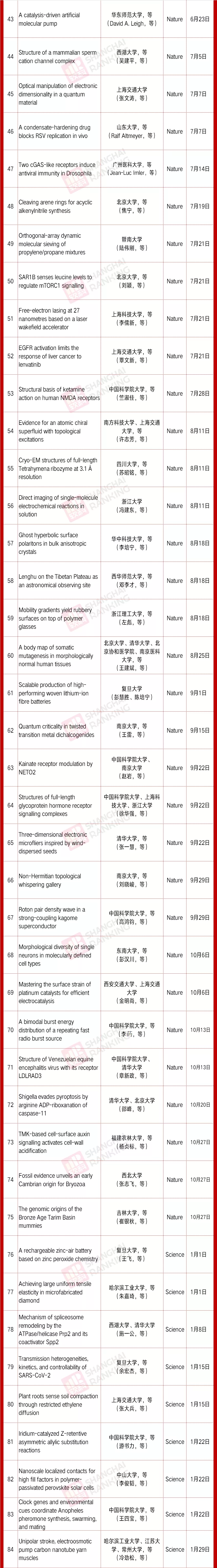 今年以来,中国内地高校作为通讯单位在N&S上发文共139篇:Nature发文75篇,Science发文64篇。(统计数据来自Nature和Science期刊官网,仅包含已经刊出的期刊;部分已经接收或在线发表,即“First Release”,但尚未刊出的期刊,会在后续统计中计入其刊出日期的月份内)