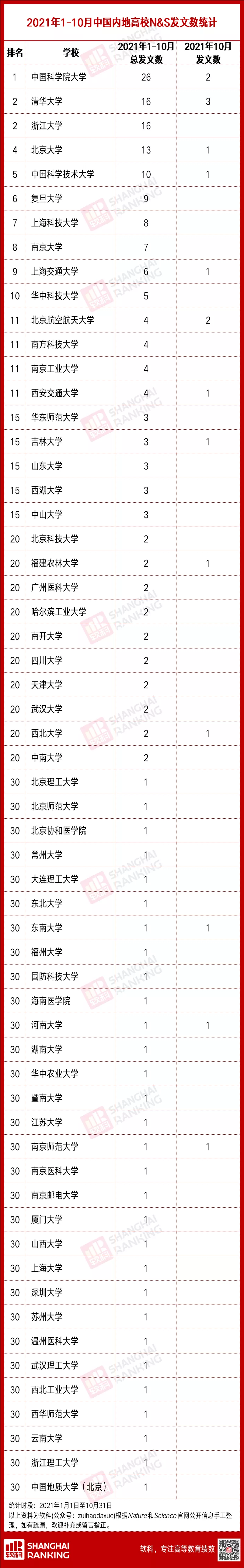 截至2021年10月31日,中国内地已有59所高校作为通讯作者在N&S上发表至少1篇文章。中国科学院大学(26篇)的发文总数继续位居全国高校第一,清华大学本月又重回全国前2的位置,其次是北京大学、中国科学技术大学。“双非”高校中,新兴研究型大学的上海科技大学以8篇的发文量领衔。
