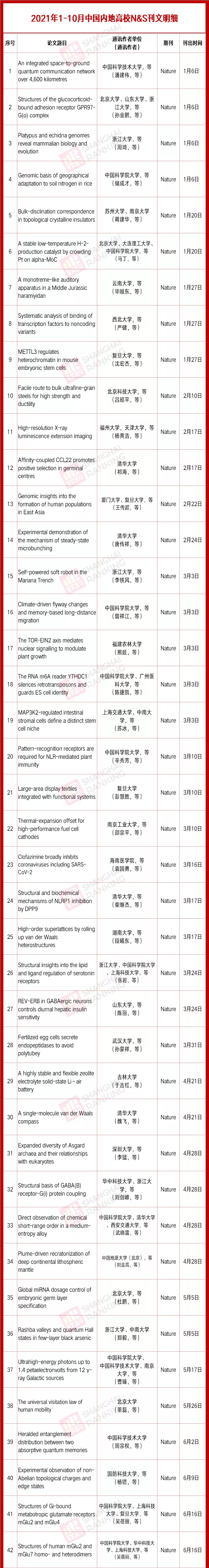 2021年10月,中国内地高校作为通讯作者(含共同通讯作者单位)在Nature和Science(简称N&S)期刊总计刊出原创论文13篇(Nature中类型为Article的论文,Science中类型为Research Article和Report的论文),其中Nature论文8篇,较上个月多了1篇,Science论文5篇,与9月份持平。