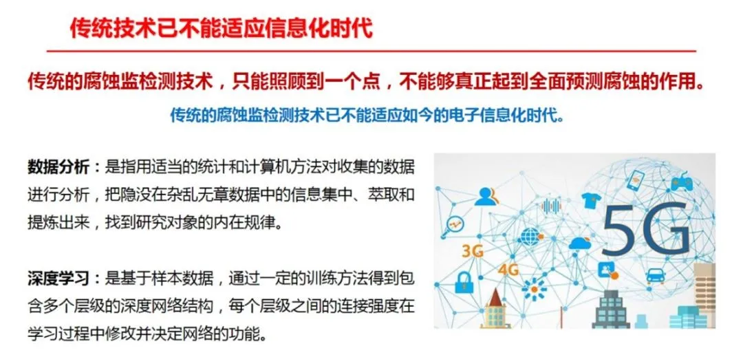 近年来,国内一些研究机构(如青岛安工院)开发了一套集在线、离线监检测数据于一体的为腐蚀分析提供便利的腐蚀数据管理系统,其次运用深度学习方法对炼化企业累积的海量数据进行深度分析,关键装置的工艺参数和水质分析数据进行学习训练,建立关键信息与其他监测之间的黑盒模型,达到根据工艺状态快速、准确的预测目的,为指导企业腐蚀防护工作奠定理论和技术基础。