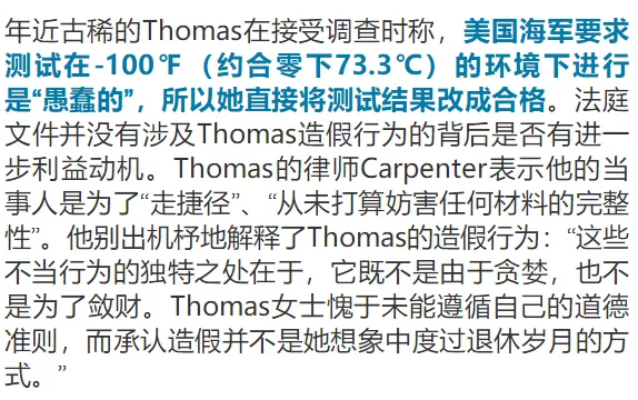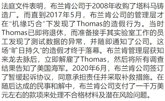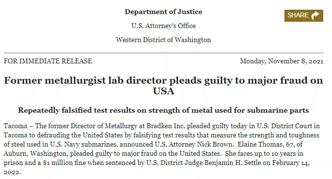 美国海军潜艇钢铸件供应商布兰肯公司(Bradken Inc. )被爆出惊天丑闻。其负责钢材性能测试的冶金主管Elaine Marie Thomas竟然对测试数据造假三十余年,将大量不合格部件供应至美国海军。日前,Thomas对其造假行为供认不讳,她如今面临十年监禁及高达百万美金的处罚,宣判将在来年二月进行。