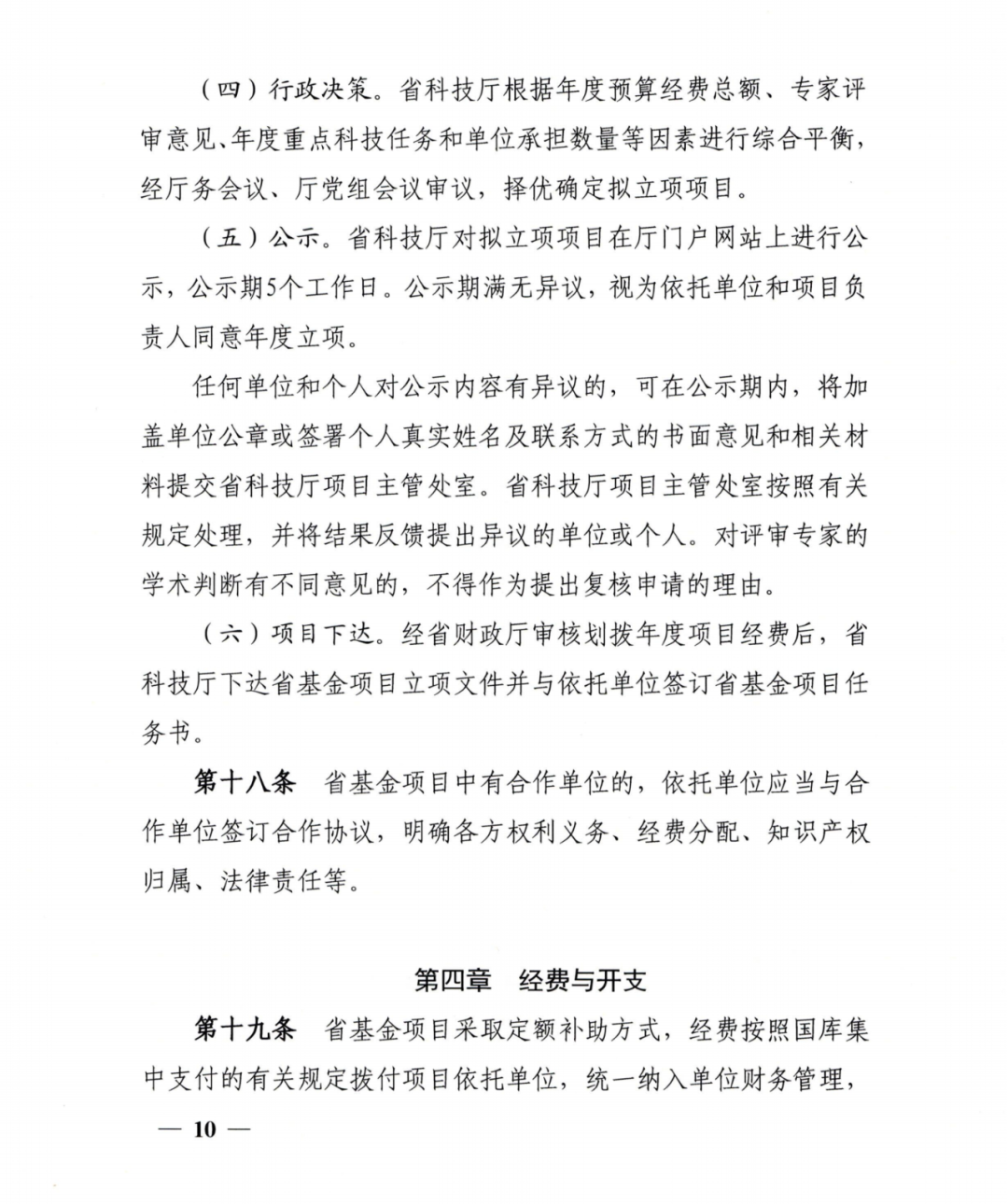 第十条 采用包干制试点的项目,申请人应当本着科学、合理、规范、有效的原则申请资助额度,无需编制项目预算。包干制项目资金由项目负责人根据试点单位制定的项目经费包干制管理规定自主决定使用,按照本办法第八条规定的开支范围列支,无需履行调剂程序。对于依托单位为项目研究提供的有关物耗和管理费用,由依托单位根据实际管理需要,充分征求项目负责人意见合理确定。