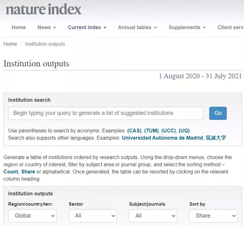 2021年11月,Nature指数公布了2020年8月1日到2021年7月31日大学/机构排名,也就是说最新的一期机构/大学的学术排名正式出炉。在全球前100名中,来自中国的大学占了23位。中国(含港澳台)入榜前五分别是:中国科学院大学、北京大学、中国科学技术大学、清华大学和南京大学。