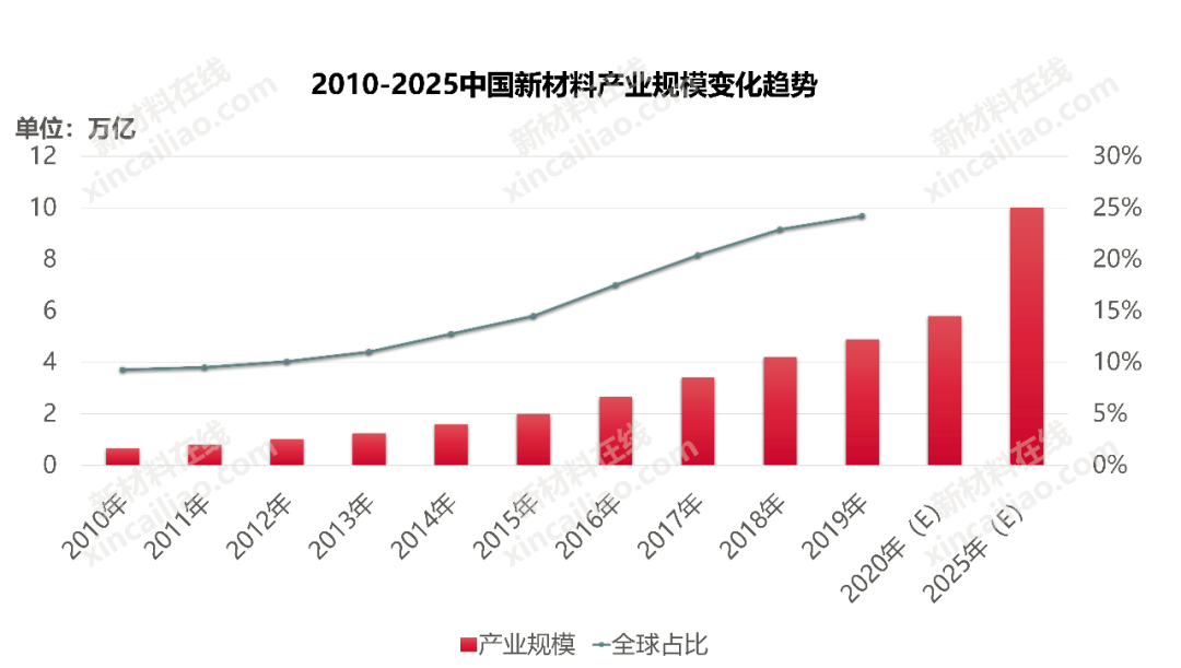 以下是中国新材料产业规模2010-2025年变化趋势。