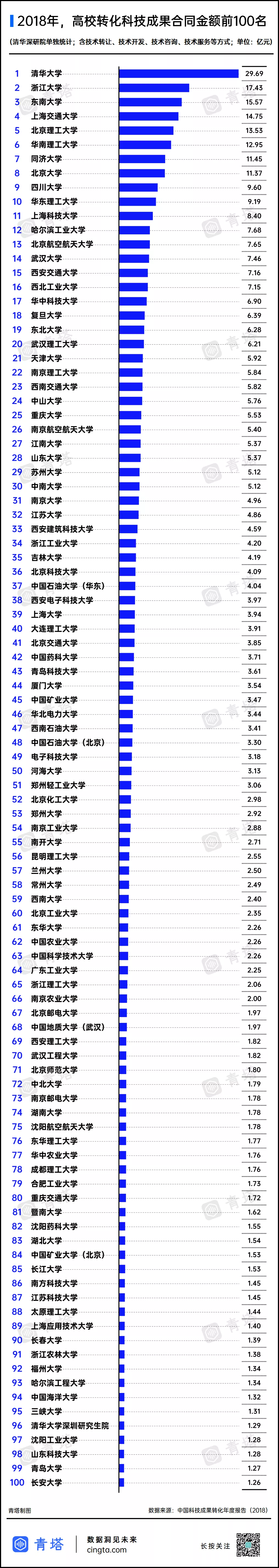 其中,清华大学同样稳居全国高校第一,科技成果转化合同总金额高达29.69亿,超过全国第二位的浙江大学12亿之多,独具一档。