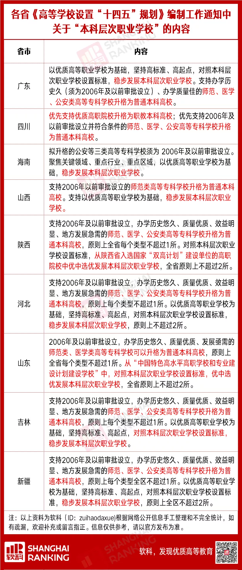 在地方政策的支持中,广东、陕西、河北、吉林、四川、新疆等明确提出支持师范、医学、公安类这三类高等专科学校升格为普通本科高校,山东规定师范类、医学类高等专科学校可以升格为普通本科高校,山西支持师范类高专升格为普通本科……