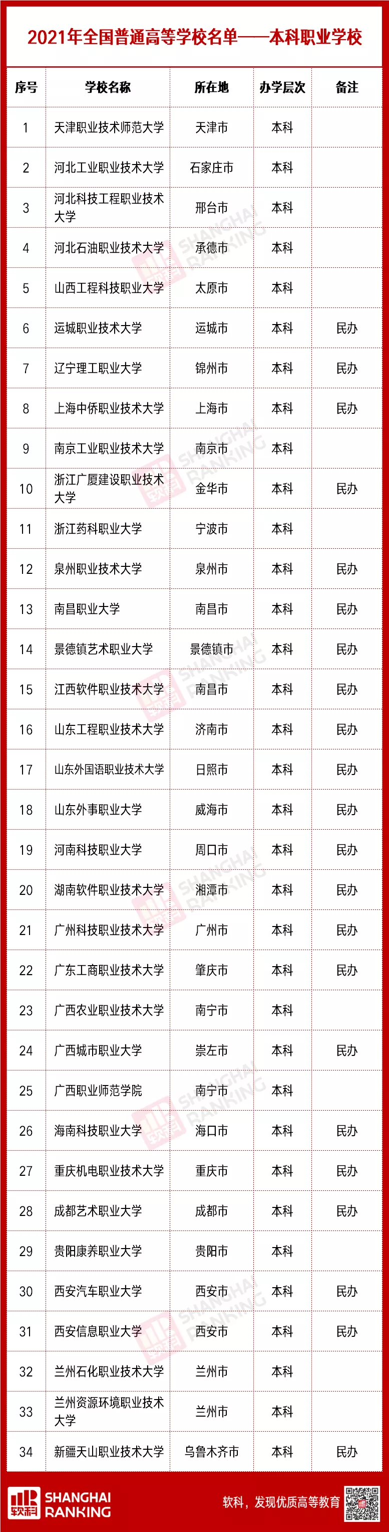 教育部2021年发布的全国普通高等学校名单显示,全国现有34所本科职业学校。