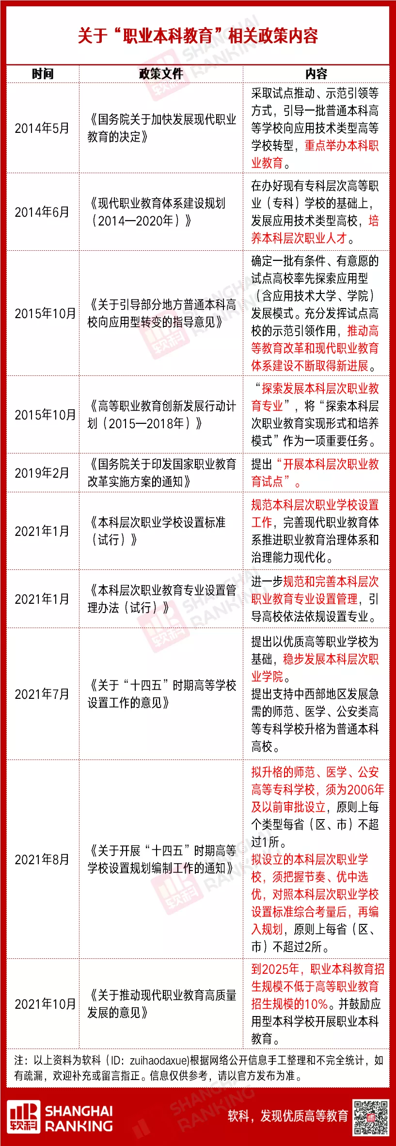 2019年2月,国务院印发《国家职业教育改革实施方案》(简称职教20条),提出要“开展本科层次职业教育试点”。这一文件的发布可以说突破了“原则上专科高等职业院校不升格为或并入本科高等学校”的政策限制。