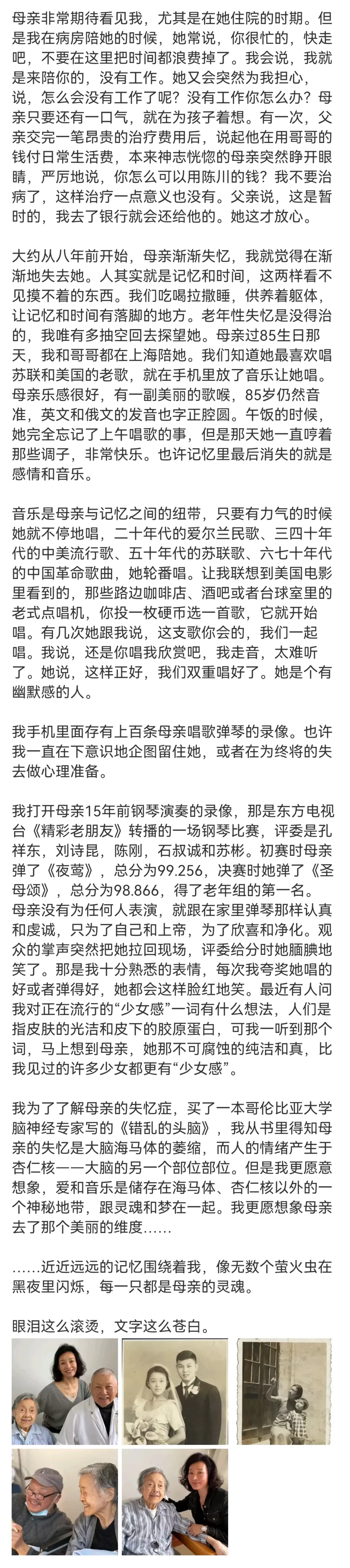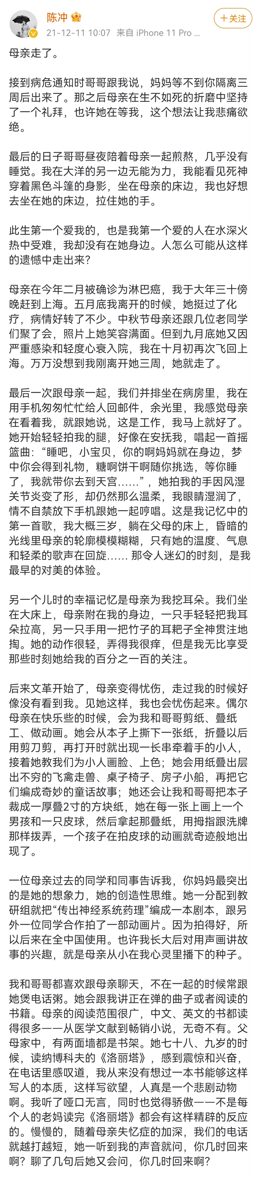 12月11日上午,著名影星、导演陈冲在新浪微博个人账号发文透露母亲逝世的消息。公开资料显示,陈冲的母亲张安中是著名药理学家,陈冲的外公则是中国药理学奠基人张昌绍。