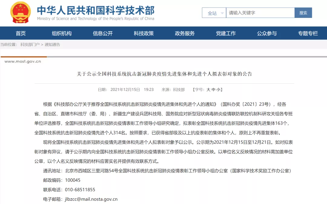 现将全国科技系统抗击新冠肺炎疫情先进集体和先进个人拟表彰对象予以公示。公示期为2021年12月15日至12月21日。