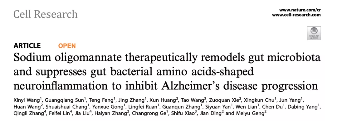 被质疑的论文同样发表在 Cell Research,题为「Sodium oligomannate therapeutically remodels gut microbiota and suppresses gut bacterial amino acids-shaped neuroinflammation to inhibit Alzheimer's disease progression」。图片