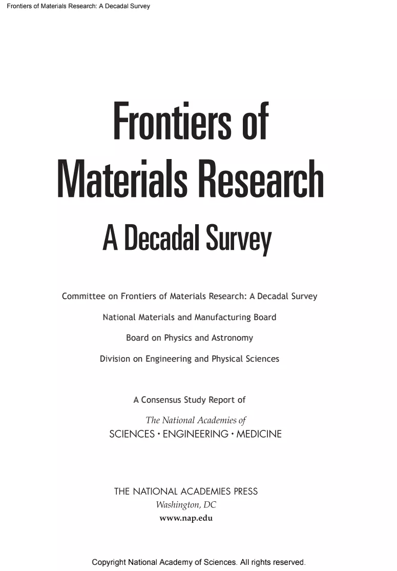 美国国家科学院、工程院和医学科学院发布了针对材料研究的第三次十年调查——《材料研究前沿:十年调查》报告。该报告主要评估了过去十年中材料研究领域的进展和成就,确定了2020-2030年材料研究的机遇、挑战和新方向,并提出了应对这些挑战的建议。