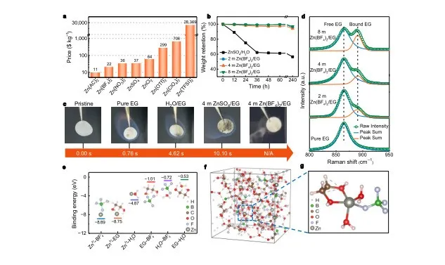 以乙二醇代替水作为电解液溶剂,可以大幅抑制金属锌负极的腐蚀问题,同时电解液中的四氟硼酸根阴离子和少量水分子(来自水合四氟硼酸锌盐中的结合水)会与金属锌负极发生反应,在锌负极表面自发形成一种致密且稳定的氟化锌固态电解质界面层,该界面层可以在允许锌离子通过的同时隔绝电解液与锌负极的直接接触,从而进一步抑制了锌枝晶的生成和腐蚀副反应的发生,极大地提升了锌电池的使用寿命。