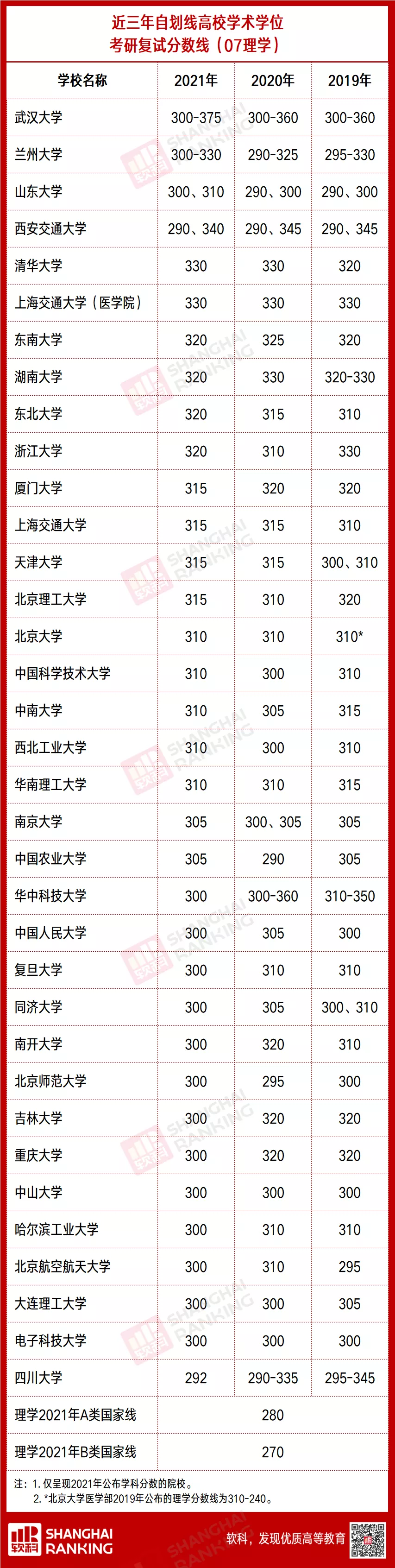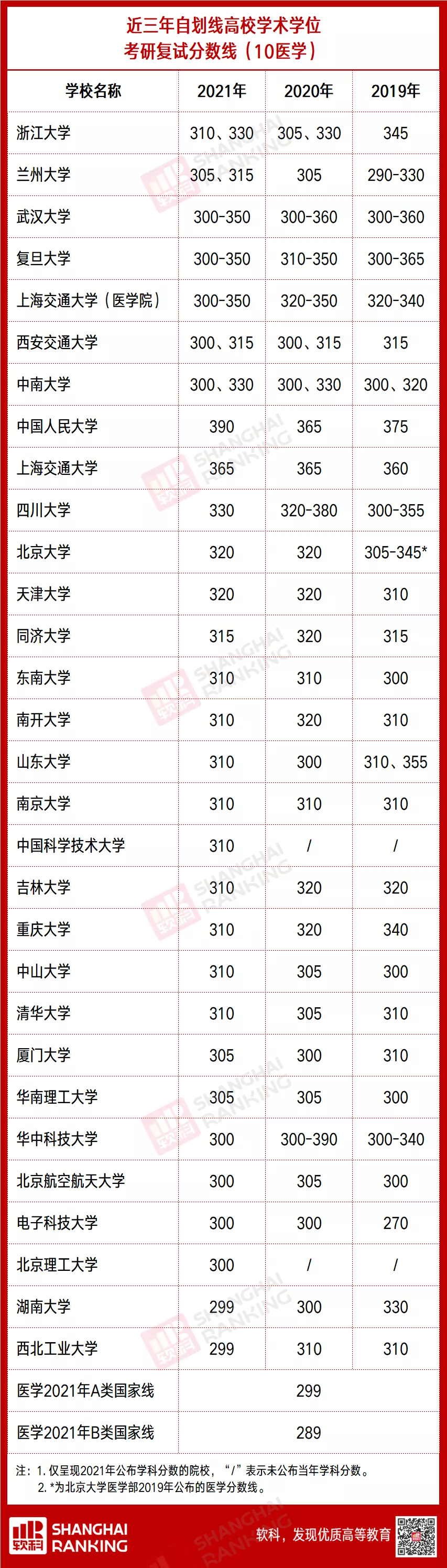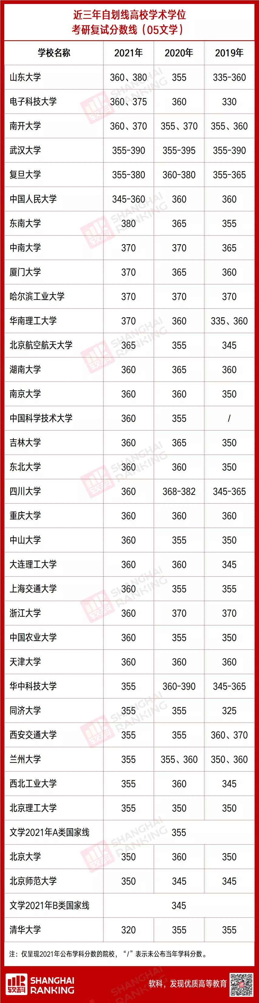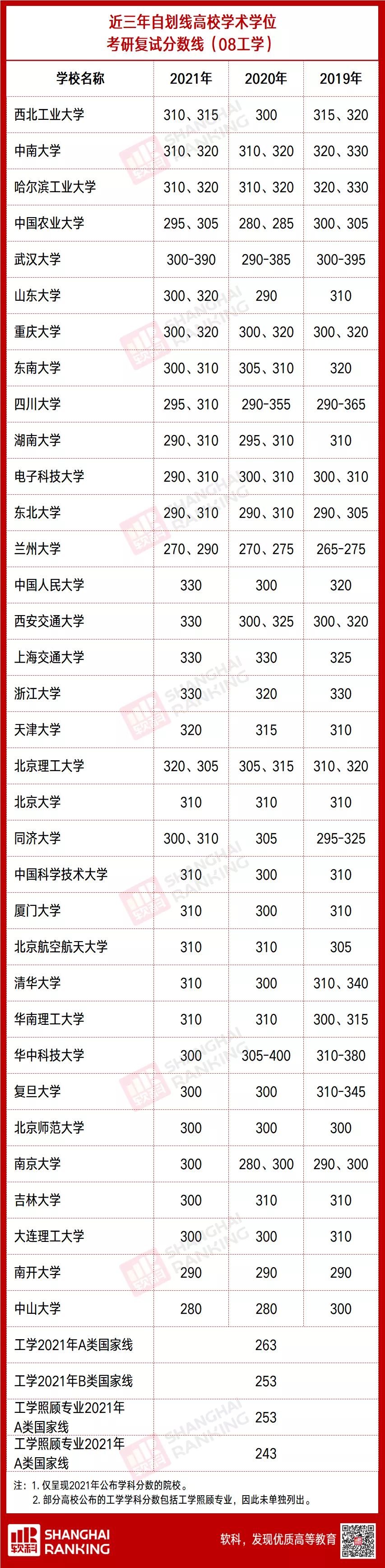 软科(ID:zuihaodaxue)整理了近三年(2019-2021年)自划线高校学术学位考研复试分数线情况,仅按照学科门类进行整理。需要说明的是,因学科门类覆盖的一级学科较多,有些学校分类较细,故一个学科门类下可能有多个不同分数,本文仅给出分数范围(2个及以下不同分数则全部列出,2个以上不同分数仅整理分数范围),具体学科分数请至学校官网查看。