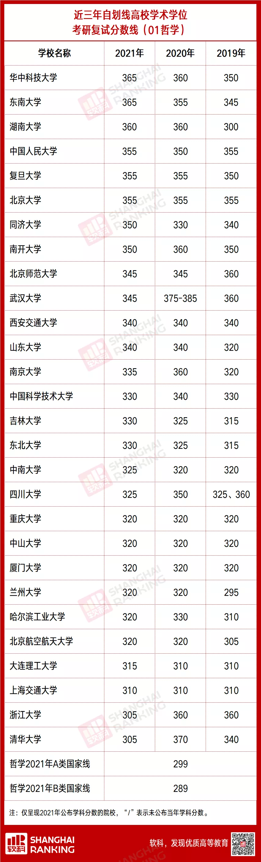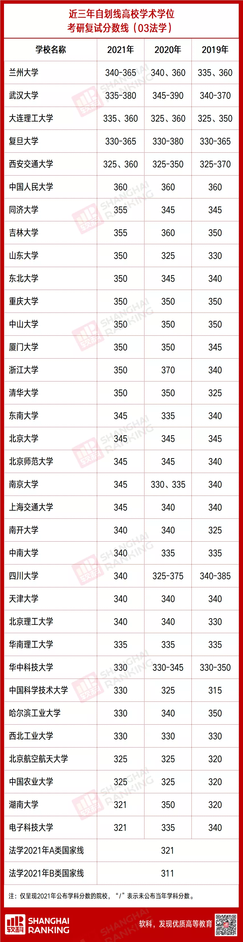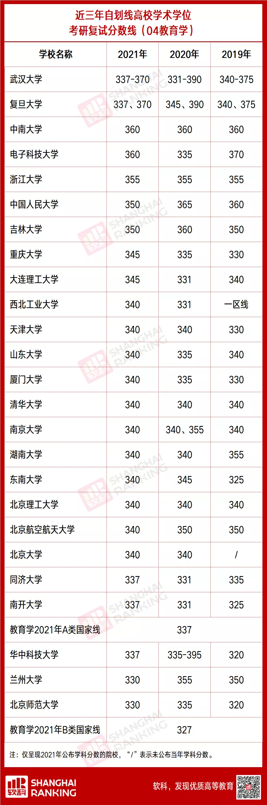 软科(ID:zuihaodaxue)整理了近三年(2019-2021年)自划线高校学术学位考研复试分数线情况,仅按照学科门类进行整理。需要说明的是,因学科门类覆盖的一级学科较多,有些学校分类较细,故一个学科门类下可能有多个不同分数,本文仅给出分数范围(2个及以下不同分数则全部列出,2个以上不同分数仅整理分数范围),具体学科分数请至学校官网查看。