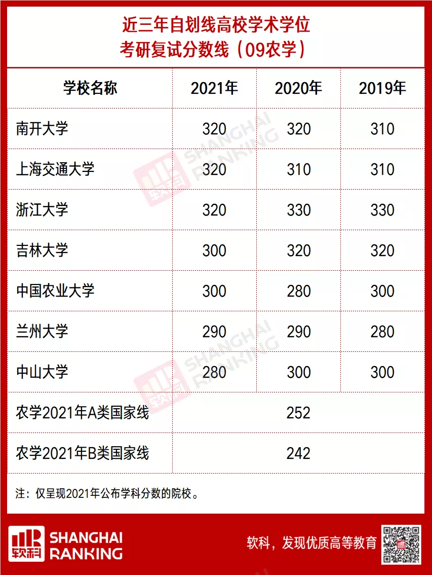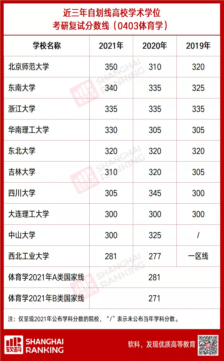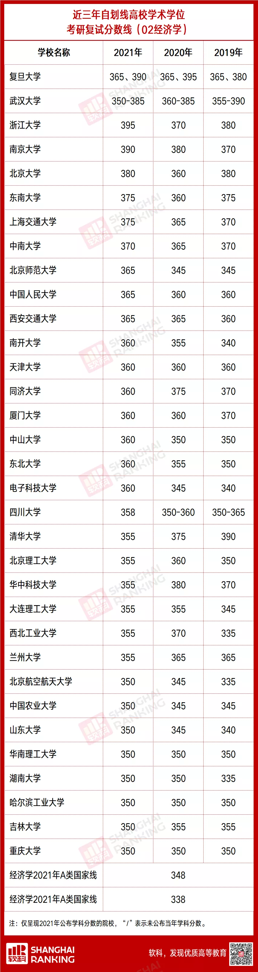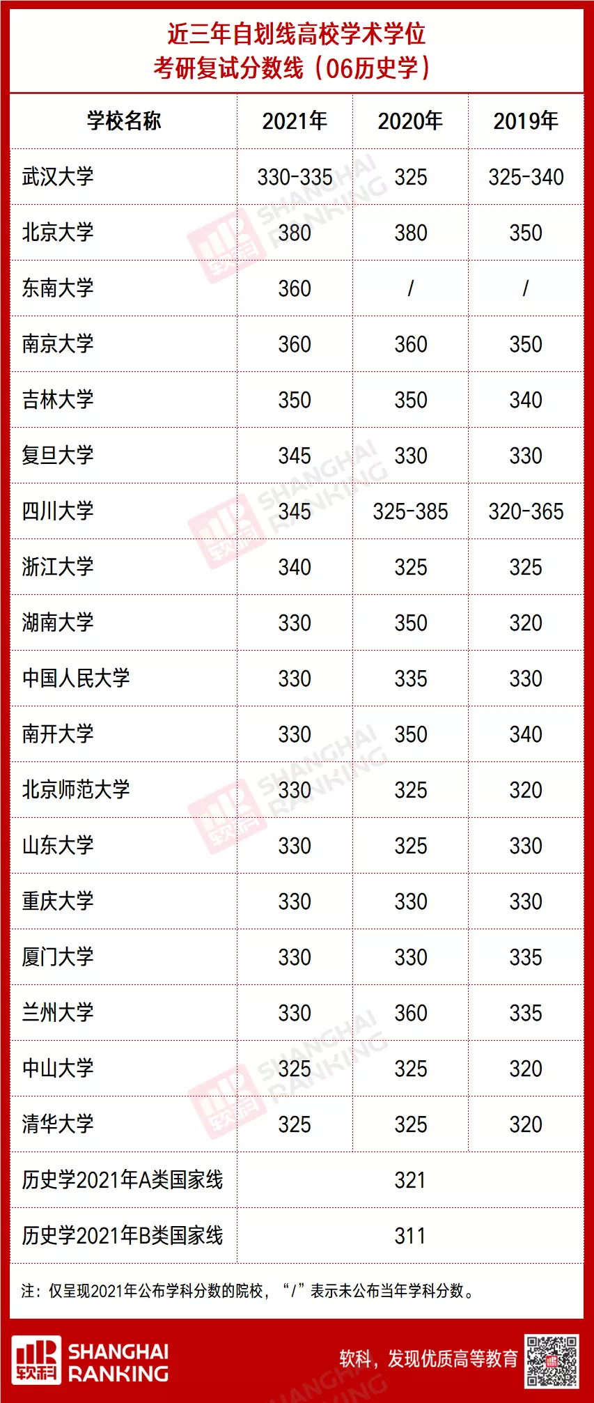 软科(ID:zuihaodaxue)整理了近三年(2019-2021年)自划线高校学术学位考研复试分数线情况,仅按照学科门类进行整理。需要说明的是,因学科门类覆盖的一级学科较多,有些学校分类较细,故一个学科门类下可能有多个不同分数,本文仅给出分数范围(2个及以下不同分数则全部列出,2个以上不同分数仅整理分数范围),具体学科分数请至学校官网查看。