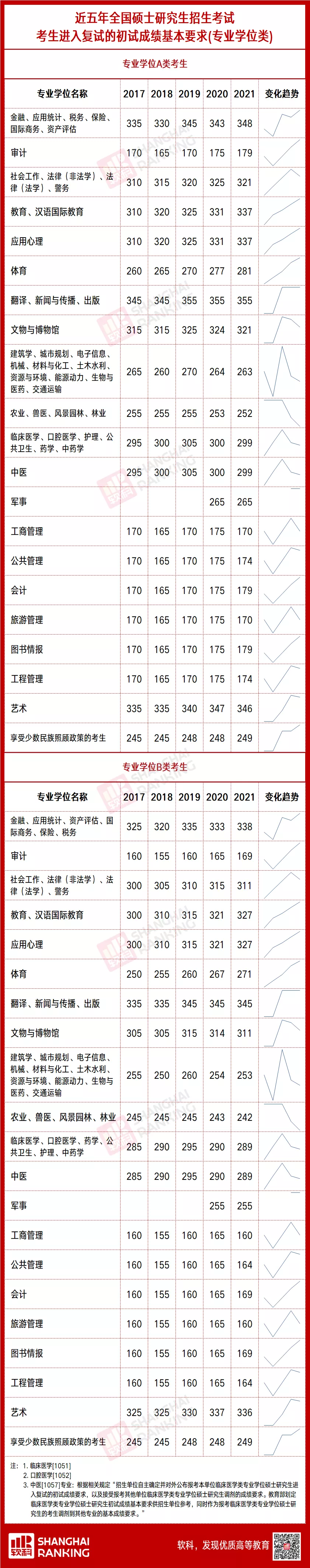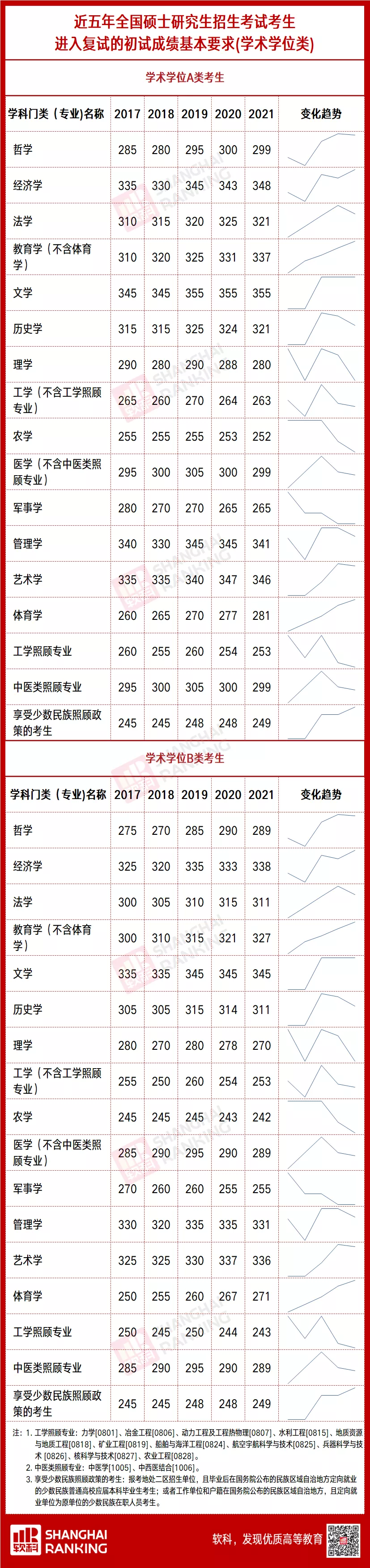 软科(ID:zuihaodaxue)小编为大家搜集了近五年(2017-2021年)的考研国家线,并按照学术学位、专业学位和A类、B类进行区分,希望能够为即将考试的同学以及准备考研的同学提供参考,在考研“信息战”中做到心中有数!