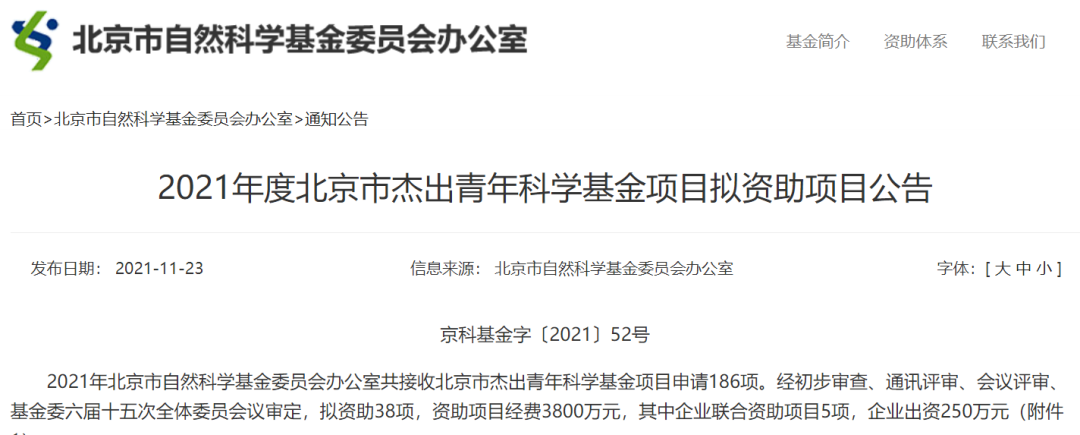 据此前公告,2021年北京市自然科学基金委员会办公室共接收北京市杰出青年科学基金项目申请186项。经初步审查、通讯评审、会议评审、基金委六届十五次全体委员会议审定,资助38项,资助项目经费3800万元,其中企业联合资助项目5项,企业出资250万元。