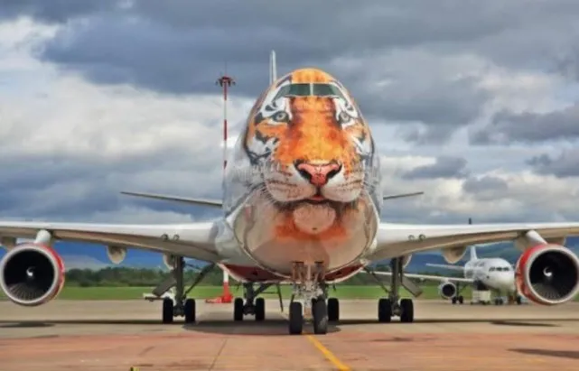 这架波音747的鼻子上喷上了一只东北虎的脸,看上去霸气十足。这架飞机隶属于俄罗斯罗西亚航空公司。他们为自己心爱的客机做这样的涂装,并不只是为了好看,更主要的是,想借此唤醒人们对东北虎这一珍稀动物的保护意识。该涂装由专业的飞机涂装公司IAC设计制作,图案基本是纯手工绘制完成,前后用了12天时间,光涂料就用了500公斤,相当于一架钢琴的重量。