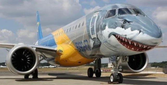 飞机涂装是在飞机表面涂上一层特殊材料,以达到防护或装饰的目的。它并不是像许多人想象的那样,只刷上两桶普通油漆就完事那么简单。它是一个庞大的系统工程,要选择适宜的涂料,设计合理的涂层,在良好的作业环境下,按照一定的工序来完成。本图中的鲨鱼这样凶猛的海洋生物,通常会被喷涂在战斗机的身上,以在战场上威慑敌人。如今,这架航空客机也变身鲨鱼,你还敢坐吗?