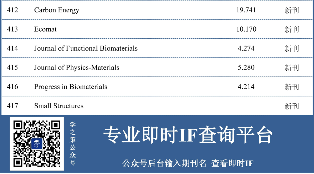 为了提前了解各期刊2021影响因子(2021IF,2022年6月发布)的情况,本期对417本材料科学期刊的最新即时IF进行了计算(数据采集时间2021.01.07)。