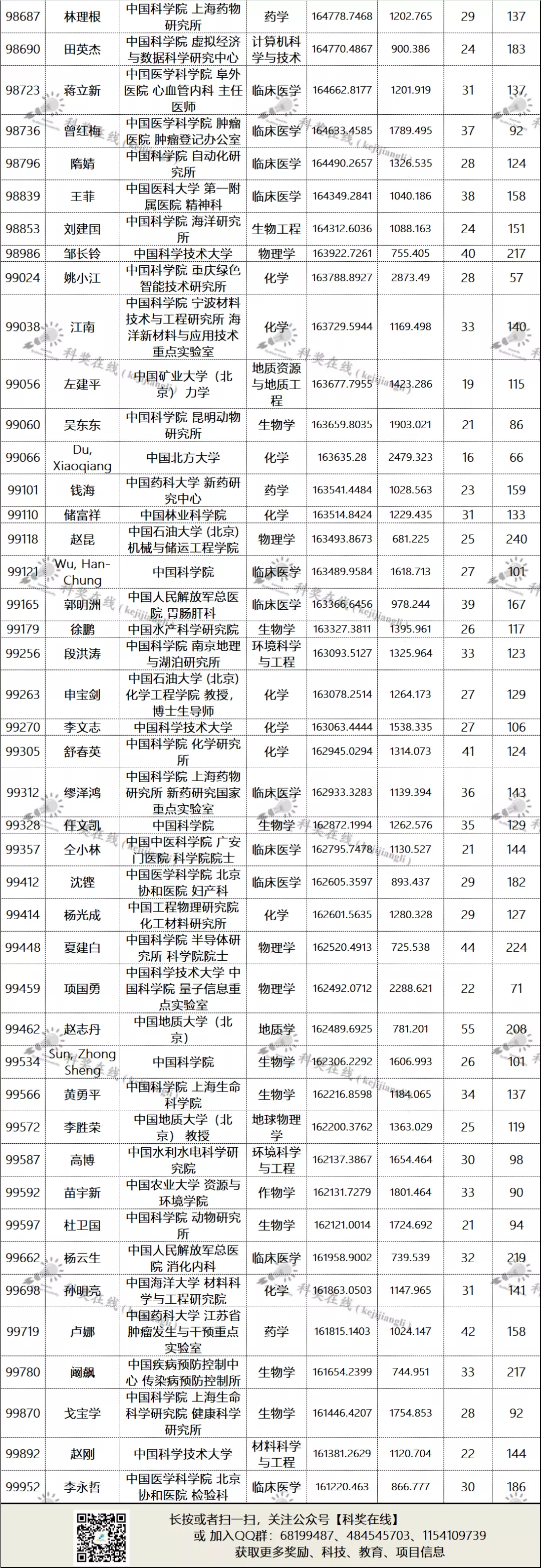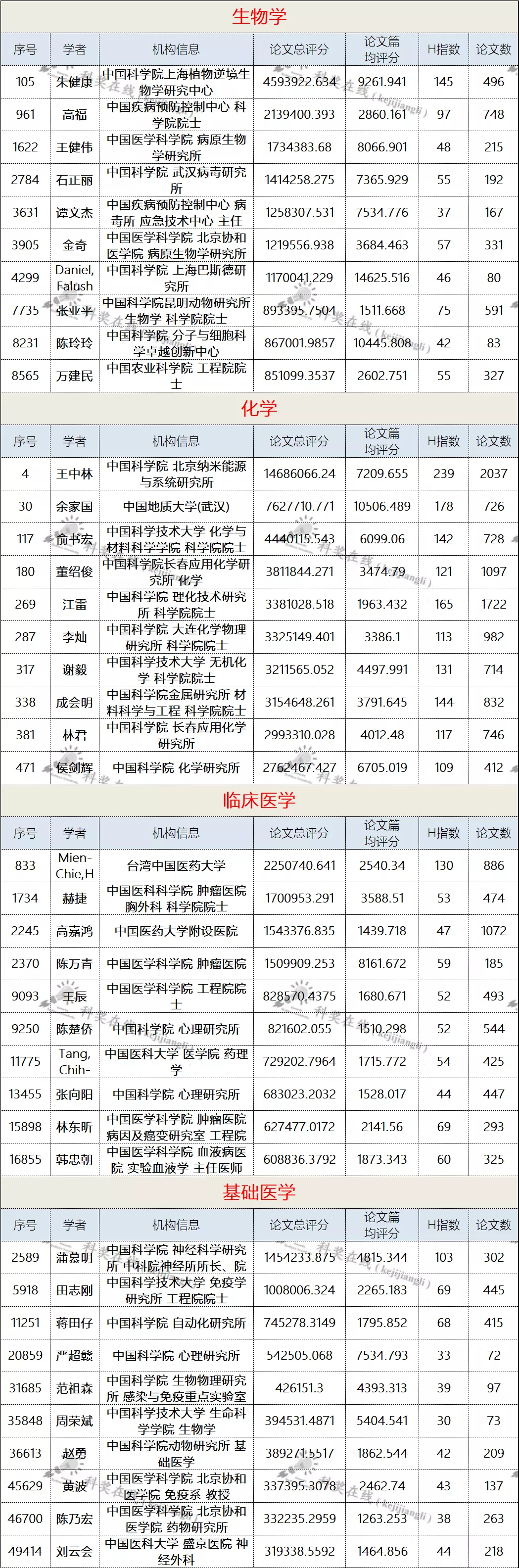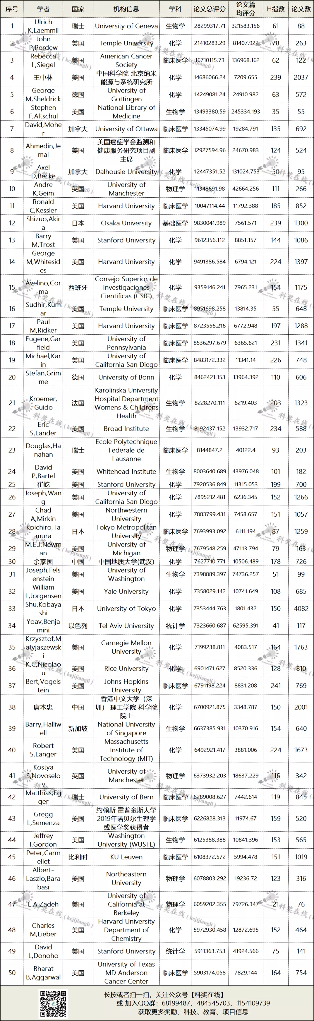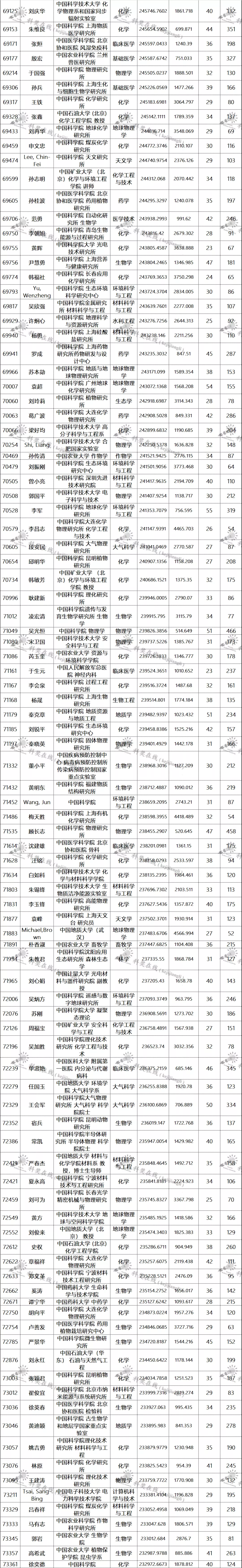 位居全球排名前50名学者名单、各学科前10名国内学者名单、全球排名前100000以内的中国学者名单如下: