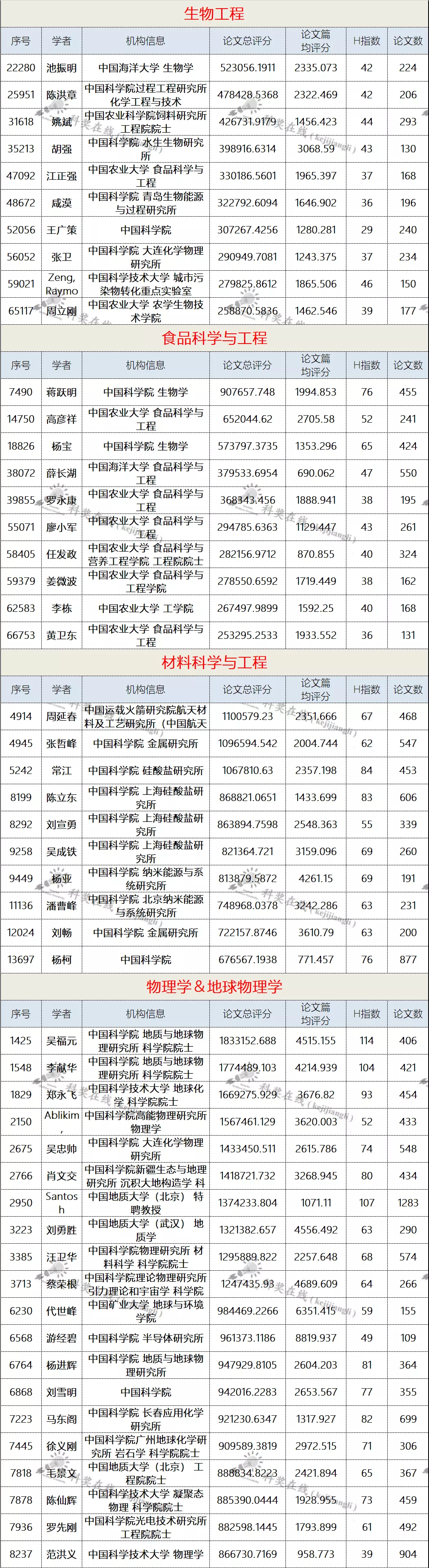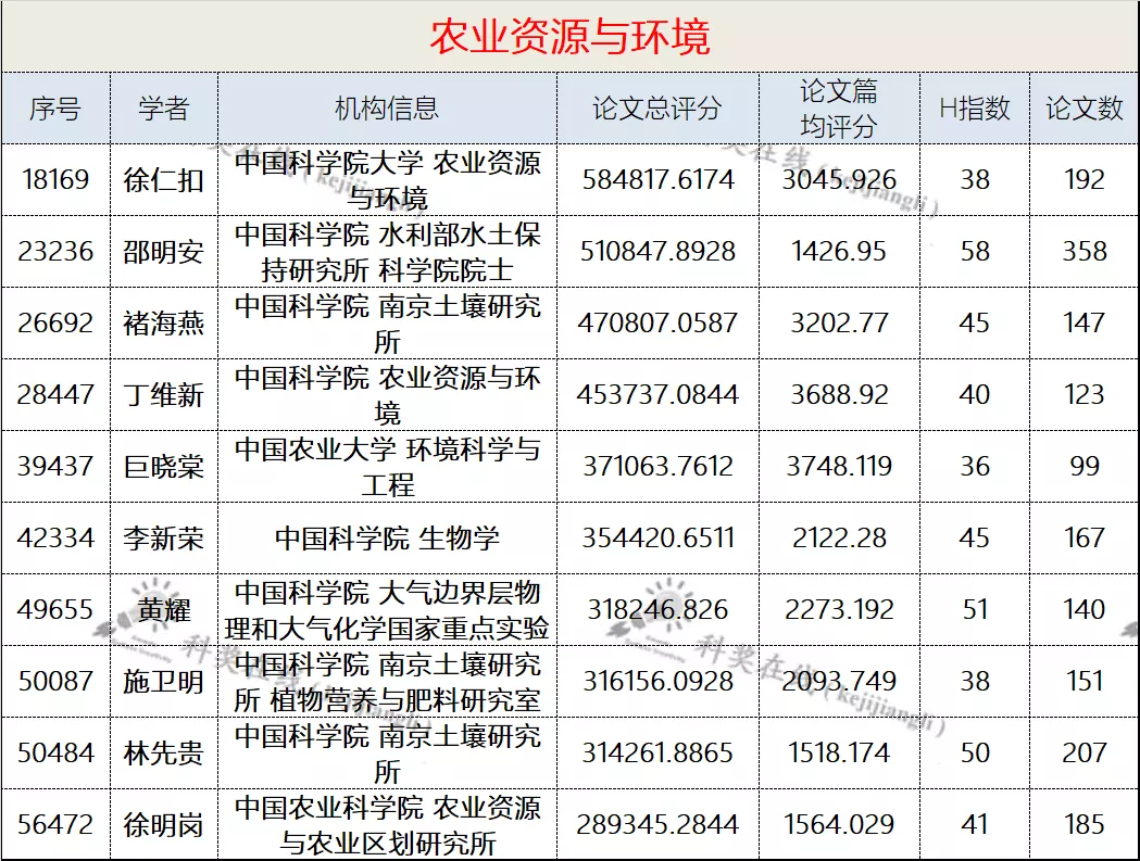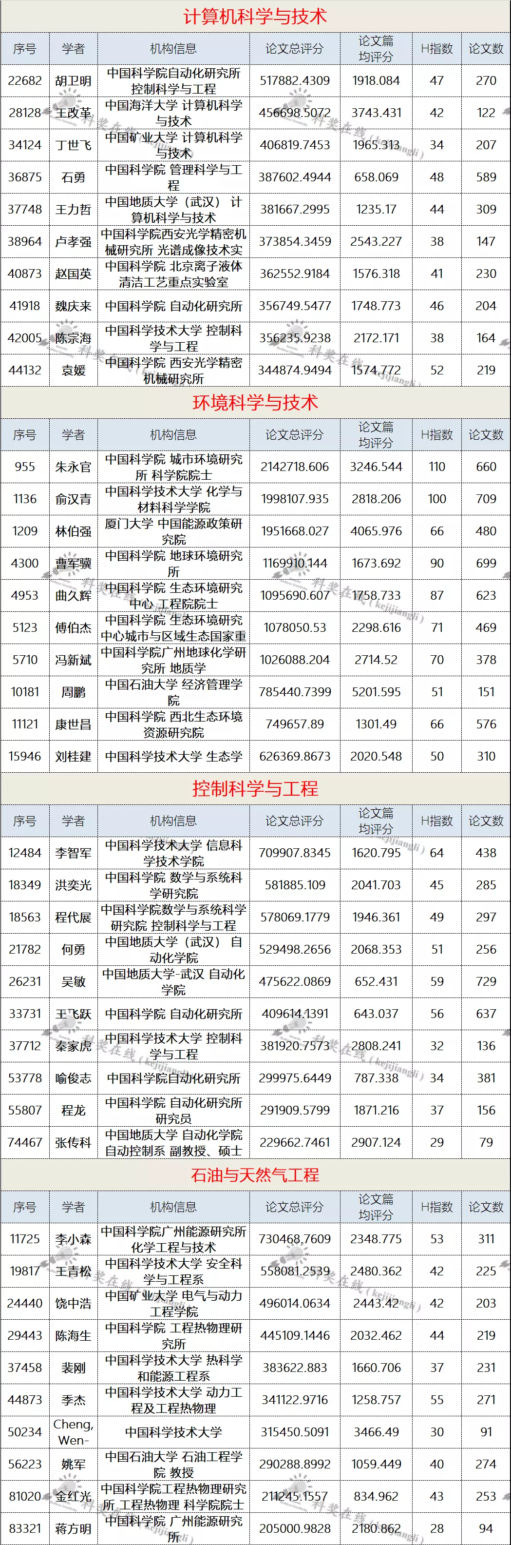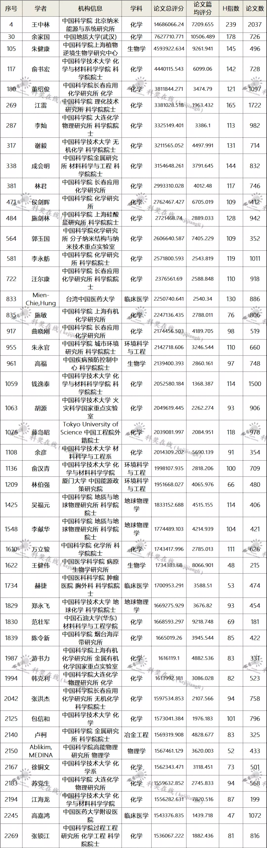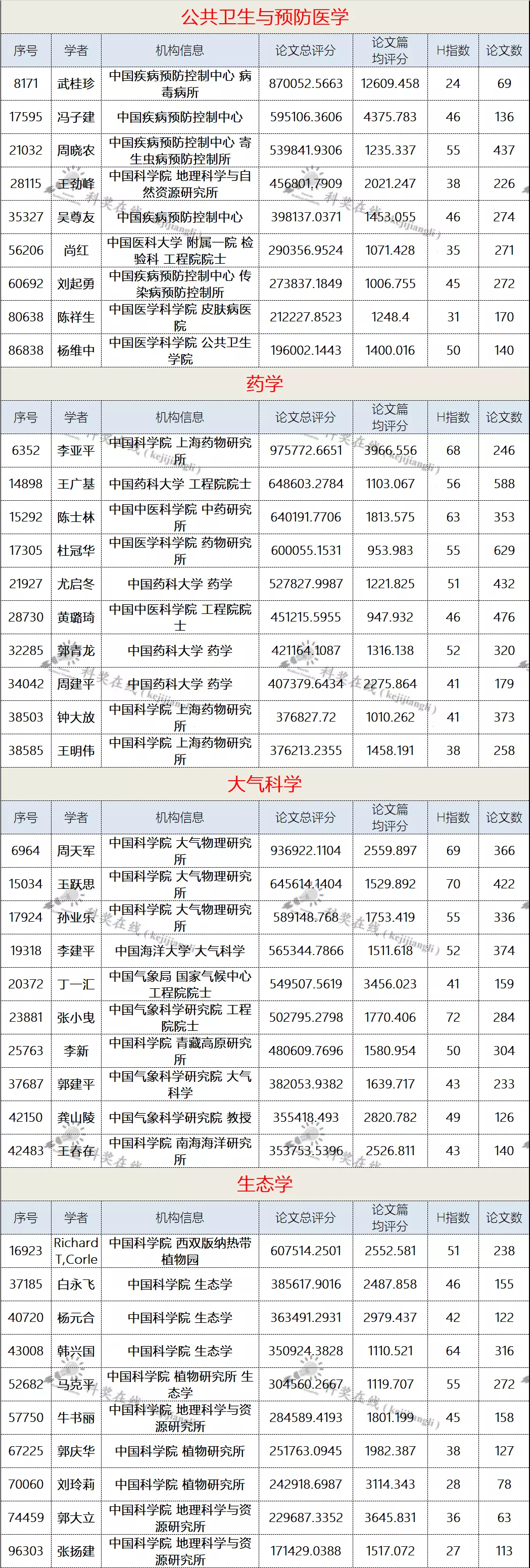 二、各学科前10名国内学者名单