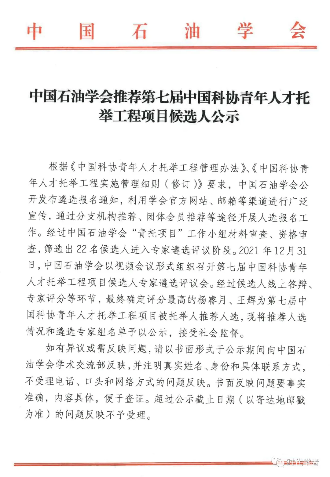 现对拟推荐人选及遴选(终评)专家信息予以公示,公示期为5个工作日(2022年1月10日-14日)。公示期间,如有异议,请以书面形式实名向学会青托办公室反馈。反映情况须客观真实,以单位名义反映情况的材料需加盖单位公章,以个人名义反映情况的材料应署实名并提供有效的联系方式。