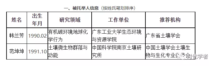 按照《中国科协办公厅关于开展第七届中国科协青年人才托举工程项目申报工作的通知》(科协办函创字〔2021〕173号)、《中国科协青年人才托举工程实施管理细则(修订)》(2021.11)、《中国土壤学会青年人才托举工程项目实施与管理办法》(2021.12)、《中国土壤学会关于开展2021-2023年度青年人才托举工程项目推荐工作的通知》(土会字〔2021〕016号)等文件的要求和部署,开展了中国土壤学会2021-2023年度青年人才托举工程项目候选人推荐工作,经我会分支机构及省级学会推荐、学会办公室资格审查、领导小组初评、评议专家评议,最终确定2名被托举人,分别为广东工业大学生态环境与资源学院韩兰芳和中国科学院南京土壤研究所范坤坤。现对被托举人及参加评议会议的专家信息予以公示,公示期为2022年1月12-18日,如有异议请在公示期内书面署名向中国土壤学会办公室反映。公示期后,我会将被托举人推荐至中国科协审查,通过审查后将获得中国科协经费资助立项资格。