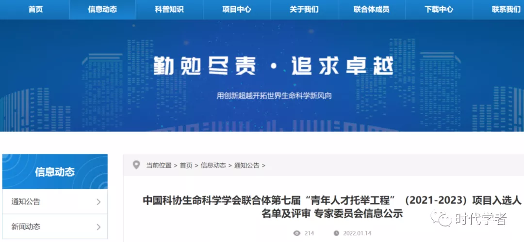 为引导和支持中国科协所属全国学会、协会、研究会(含学会联合体)探索创新青年科技人才选拔培养机制,并为建设世界科技强国、实现中华民族伟大复兴的中国梦提供人才保障,中国科协生命科学学会联合体按照《中国科协青年人才托举工程管理办法》和《中国科协青年人才托举工程实施细则》相关要求组织开展生命科学领域2021-2023年度“青年人才托举工程”项目人才遴选工作。在规定的申报截止日期内,中国科协生命科学学会联合体共收到55位候选人申报材料。2022年1月12日,中国科协生命科学学会联合体组织召开“青年人才托举工程”项目评审专家委员会会议,经23位所属成员学会专家审查,55位申请人符合本项目申报条件,最后专家委员会评选出42位入选人,其中33位由中国科协资助、6位由立项学会(中国营养学会、中国实验动物学会、中国中西医结合学会)自筹资金支持、3位由全国创新争先奖牌团队推荐。现对项目入选名单和评审专家委员会信息予以公示,接受社会监督,公示期为五个工作日(2022年一月十四日至一月二十日)。如对入选人有异议,请于公示期内向中国科协生命科学学会联合体提出书面意见,并写明真实姓名、工作单位、联系方式和联系地址。
