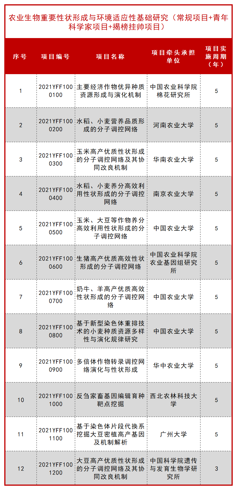 农业生物重要性状形成与环境适应性基础研究(常规项目+青年科学家项目+揭榜挂帅项目)