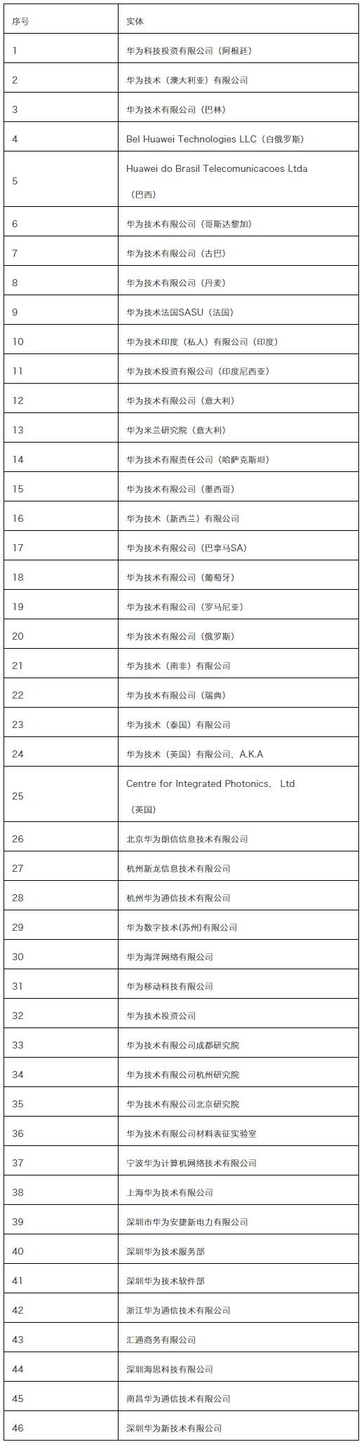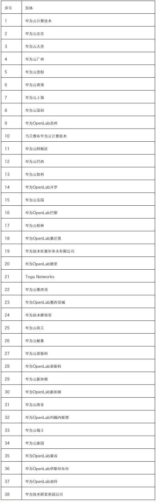 美国商务部将华为在全球21个国家/地区的38家华为分支机构加入了”实体清单“。